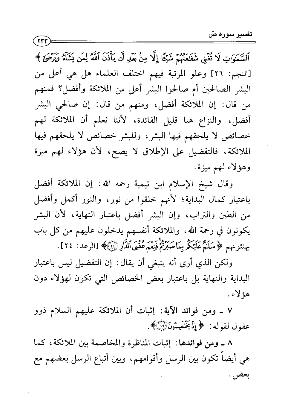 السَّمَاوَاتِ لَا تُغْنِي شَفَاعَتُهُمْ شَيْئًا إِلَّا مِنْ بَعْدِ أَنْ يَأْذَنَ اللَّهُ لِمَنْ يَشَاءُ وَيَرْضَى} [النجم: ٢٦] وعلو المرتبة فيهم اختلف العلماء هل هي أعلى من البشر الصالحين أم صالحوا البشر أعلى من الملائكة وأفضل؟ فمنهم من قال: إن الملائكة أفضل، ومنهم من قال: إن صالحي البشر أفضل، والنزاع هنا قليل الفائدة، لأننا نعلم أن الملائكة لهم خصائص لا يلحقهم فيها البشر، وللبشر خصائص لا يلحقهم فيها الملائكة، فالتفضيل على الإطلاق لا يصح، لأن هؤلاء لهم ميزة وهؤلاء لهم ميزة.