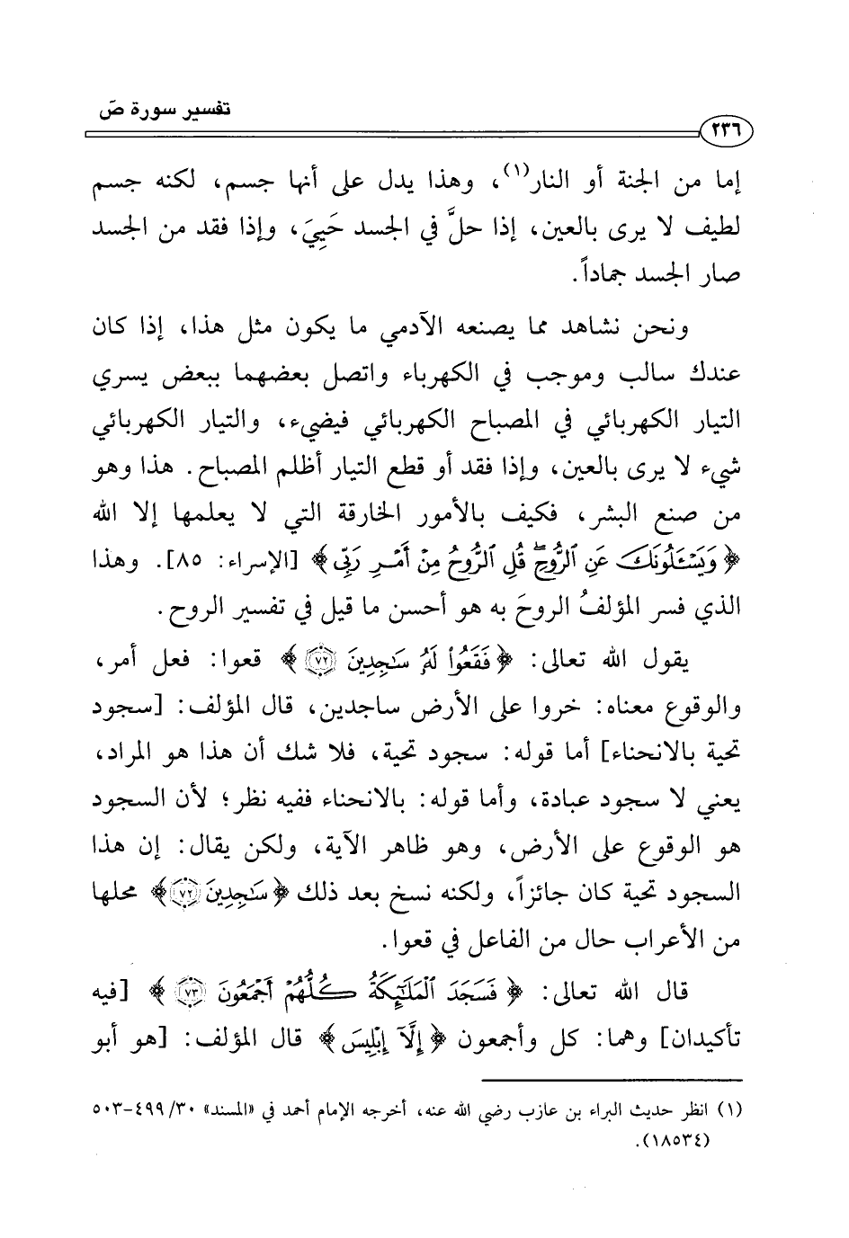ونحن نشاهد مما يصنعه الآدمي ما يكون مثل هذا، إذا كان عندك سالب وموجب في الكهرباء واتصل بعضهما ببعض يسري التيار الكهربائي في المصباح الكهربائي فيضيء، والتيار الكهربائي شيء لا يرى بالعين، وإذا فقد أو قطع التيار أظلم المصباح. هذا وهو من صنع البشر، فكيف بالأمور الخارقة التي لا يعلمها إلا الله {وَيَسْأَلُونَكَ عَنِ الرُّوحِ قُلِ الرُّوحُ مِنْ أَمْرِ رَبِّي} [الإسراء: ٨٥]. وهذا الذي فسر المؤلفُ الروحَ به هو أحسن ما قيل في تفسير الروح.