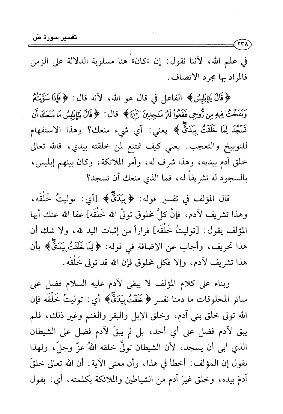 قال المؤلف في تفسير قوله: {بِيَدَيَّ} [أي: توليتُ خَلْقَه، وهذا تشريف لآدم، فإنَّ كلَّ مخلوق تولىّ الله خَلْقَه] عفا الله عنك أيها المؤلف يقول: [توليتُ خَلْقَه] فرارًا من إثبات اليد لله، ولا شك أن هذا تحريف، وأجاب عن الإضافة في قوله: {لِمَا خَلَقْتُ بِيَدَيَّ} بأن هذا تشريف لآدم، وإلا مخلوق فإن الله قد تولى خَلْقَه.