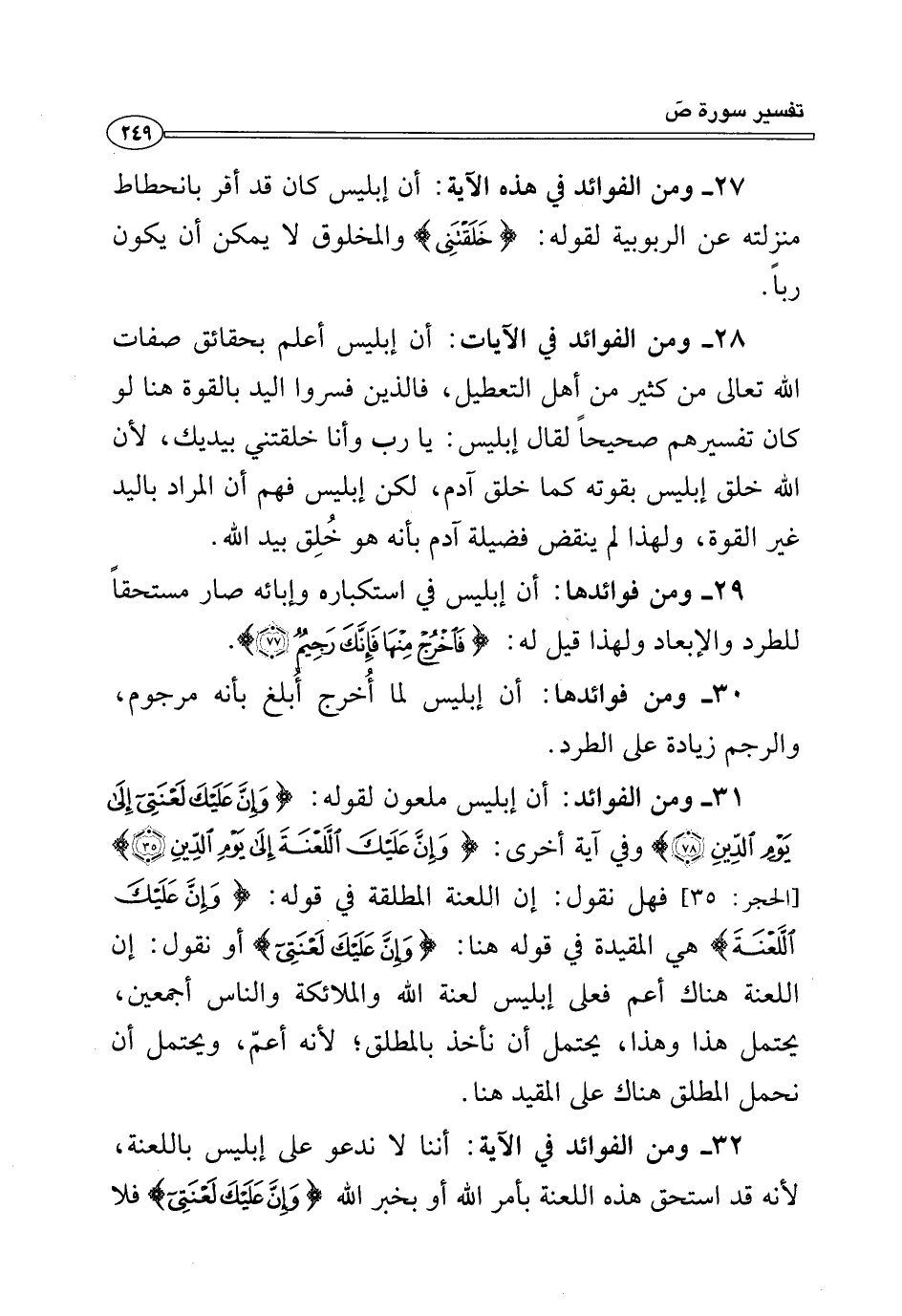 ٣١ - ومن الفوائد: أن إبليس ملعون لقوله: {وَإِنَّ عَلَيْكَ لَعْنَتِي إِلَى يَوْمِ الدِّينِ (٧٨)} وفي آية أخرى: {وَإِنَّ عَلَيْكَ اللَّعْنَةَ إِلَى يَوْمِ الدِّينِ (٣٥)} [الحجر: ٣٥] فهل نقول: إن اللعنة المطلقة في قوله: {وَإِنَّ عَلَيْكَ اللَّعْنَةَ} هي المقيدة في قوله هنا: {وَإِنَّ عَلَيْكَ لَعْنَتِي} أو نقول: إن اللعنة هناك أعم فعلى إبليس لعنة الله والملائكة والناس أجمعين، يحتمل هذا وهذا، يحتمل أن نأخذ بالمطلق؛ لأنه أعمّ، ويحتمل أن نحمل المطلق هناك على المقيد هنا.