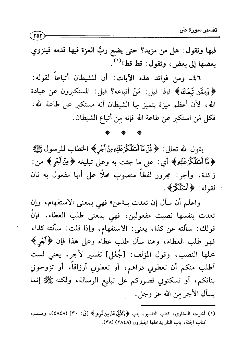 يقول الله تعالى: {قُلْ مَا أَسْأَلُكُمْ عَلَيْهِ مِنْ أَجْرٍ} الخطاب للرسول - صلى الله عليه وسلم - {مَا أَسْأَلُكُمْ عَلَيْه} أي: على ما جئت به وعلى تبليغه {مِنْ أَجْرٍ} من: زائدة، وأجر: مجرور لفظًا منصوب محلًا على أنها مفعول به ثان لقوله: {أَسْأَلُكُمْ}.