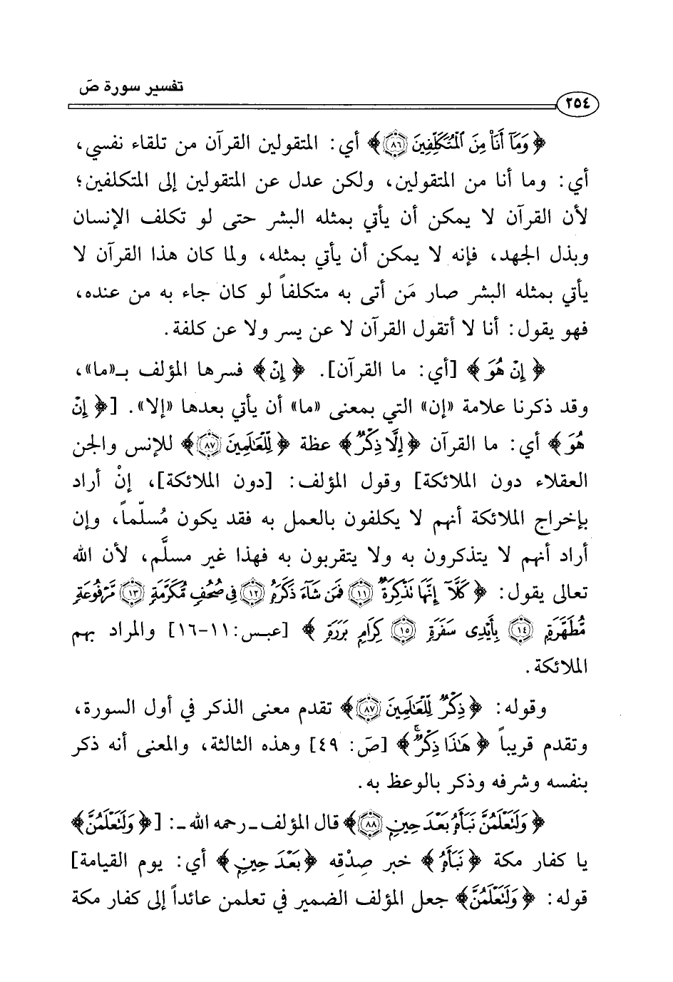 {وَلَتَعْلَمُنَّ نَبَأَهُ بَعْدَ حِينٍ (٨٨)} قال المؤلف -رحمه الله-: [{وَلَتَعْلَمُنَّ} يا كفار مكة {نَبَأَهُ} خبر صِدْقِه {بَعْدَ حِينٍ} أي: يوم القيامة] قوله: {وَلَتَعْلَمُنَّ} جعل المؤلف الضمير في تعلمن عائدًا إلى كفار مكة