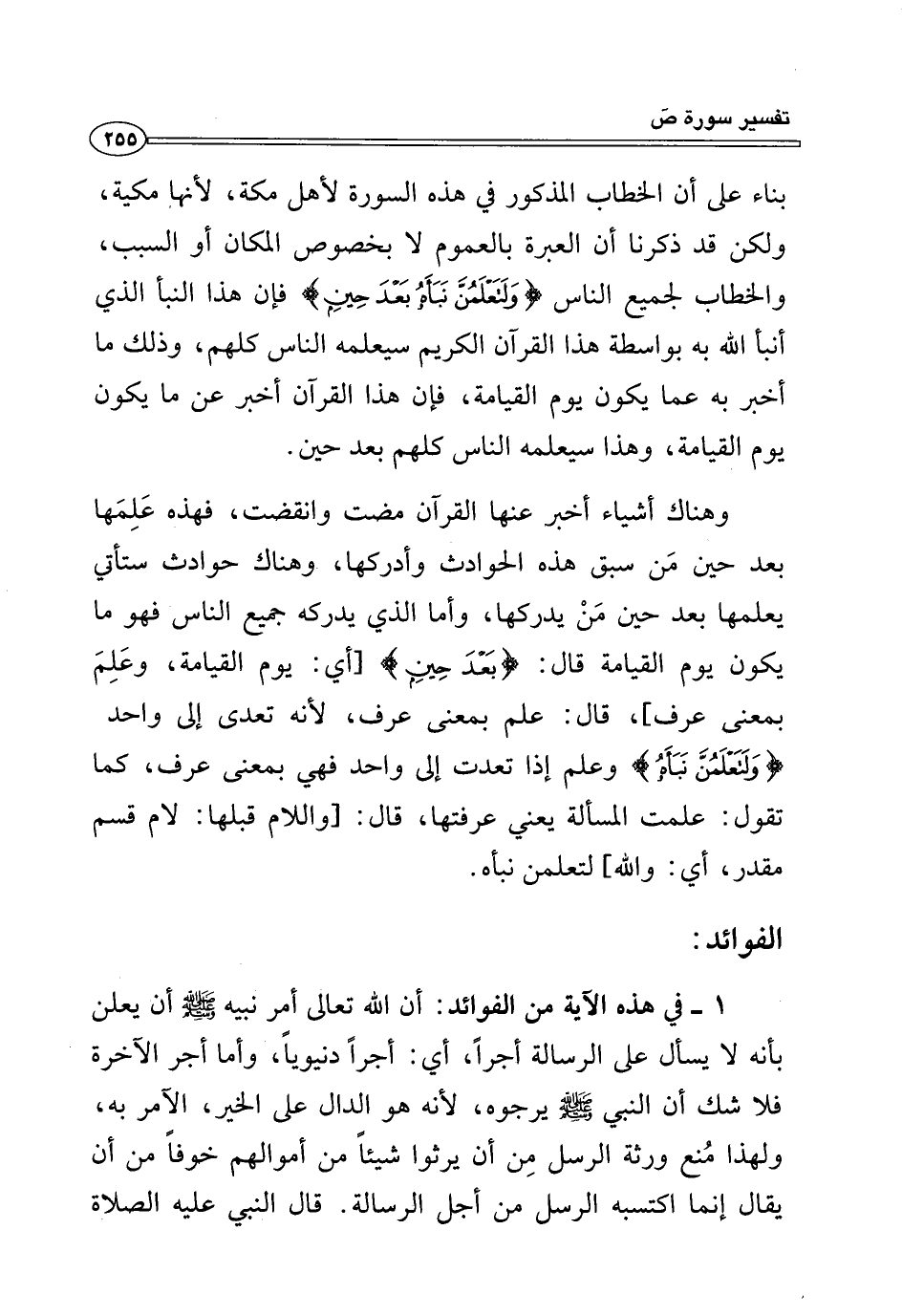 وهناك أشياء أخبر عنها القرآن مضت وانقضت، فهذه عَلِمَها بعد حين مَن سبق هذه الحوادث وأدركها، وهناك حوادث ستأتي يعلمها بعد حين مَنْ يدركها، وأما الذي يدركه جميع الناس فهو ما يكون يوم القيامة قال: {بَعْدَ حِينٍ} [أي: يوم القيامة، وعَلِمَ بمعنى عرف]، قال: علم بمعنى عرف، لأنه تعدى إلى واحد {وَلَتَعْلَمُنَّ نَبَأَهُ} وعلم إذا تعدت إلى واحد فهي بمعنى عرف، كما تقول: علمت المسألة يعني عرفتها، قال: [واللام قبلها: لام قسم مقدر، أي: والله] لتعلمن نبأه.
