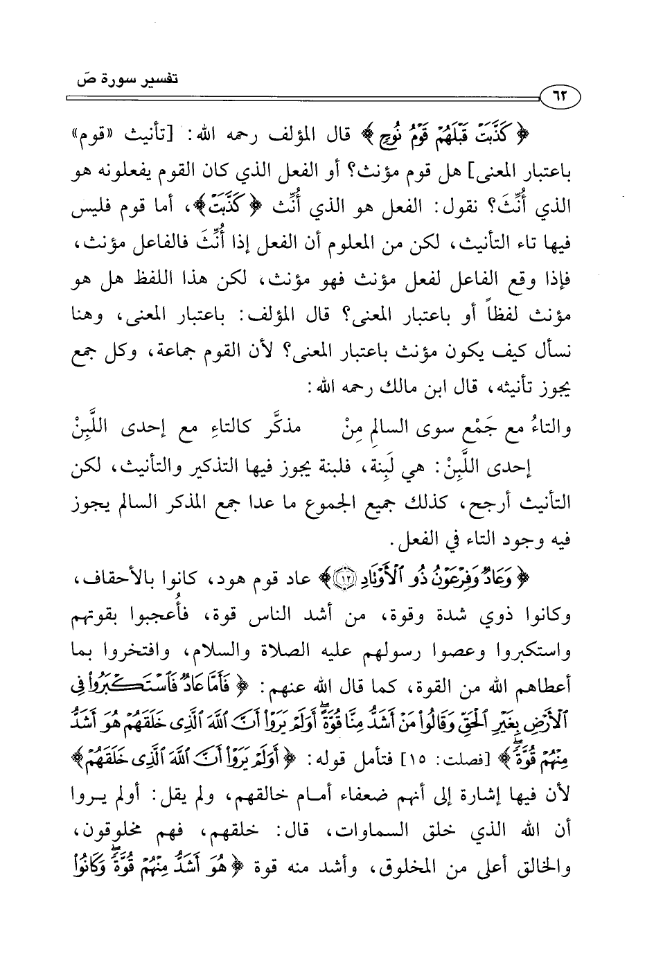 {كَذَّبَتْ قَبْلَهُمْ قَوْمُ نُوحٍ} قال المؤلف رحمه الله: [تأنيث "قوم" باعتبار المعنى] هل قوم مؤنث؟ أو الفعل الذي كان القوم يفعلونه هو الذي أُنِّث؟ نقول: الفعل هو الذي أُنِّث {كَذَّبَتْ}، أما قوم فليس فيها تاء التأنيث، لكن من المعلوم أن الفعل إذا أُنِّثَ فالفاعل مؤنث، فإذا وقع الفاعل لفعل مؤنث فهو مؤنث، لكن هذا اللفظ هل هو مؤنث لفظًا أو باعتبار المعنى؟ قال المؤلف: باعتبار المعنى، وهنا نسأل كيف يكون مؤنث باعتبار المعنى؟ لأن القوم جماعة، وكل جمع يجوز تأنيثه، قال ابن مالك رحمه الله: