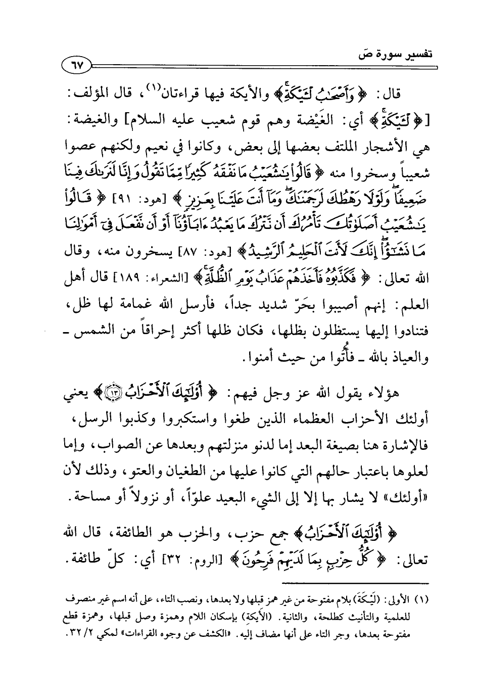 قال: {وَأَصْحَابُ الْأَيْكَةِ} والأيكة فيها قراءتان (¬١)، قال المؤلف: [{الْأَيْكَةِ} أي: الغَيْضة وهم قوم شعيب عليه السلام] والغيضة: هي الأشجار اللتف بعضها إلى بعض، وكانوا في نعيم ولكنهم عصوا شعيبًا وسخروا منه {قَالُوا يَاشُعَيْبُ مَا نَفْقَهُ كَثِيرًا مِمَّا تَقُولُ وَإِنَّا لَنَرَاكَ فِينَا ضَعِيفًا وَلَوْلَا رَهْطُكَ لَرَجَمْنَاكَ وَمَا أَنْتَ عَلَيْنَا بِعَزِيزٍ} [هود: ٩١] {قَالُوا يَاشُعَيْبُ أَصَلَاتُكَ تَأْمُرُكَ أَنْ نَتْرُكَ مَا يَعْبُدُ آبَاؤُنَا أَوْ أَنْ نَفْعَلَ فِي أَمْوَالِنَا مَا نَشَاءُ إِنَّكَ لَأَنْتَ الْحَلِيمُ الرَّشِيدُ} [هود ٨٧] يسخرون منه، وقال الله تعالى: {فَكَذَّبُوهُ فَأَخَذَهُمْ عَذَابُ يَوْمِ الظُّلَّةِ} [الشعراء: ١٨٩] قال أهل العلم: إنهم أصيبوا بحَرّ شديد جدًا، فأرسل الله غمامة لها ظل، فتنادوا إليها يستظلون بظلها، فكان ظلها أكثر إحراقًا من الشمس -والعياذ بالله- فأُتُوا من حيث أمنوا.