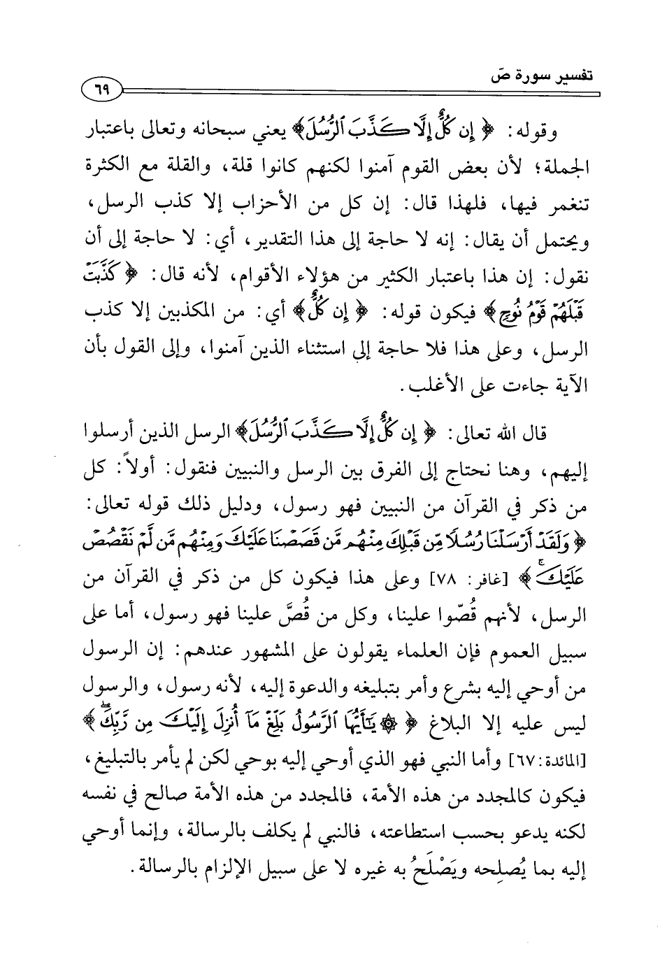 قال الله تعالى: {إِنْ كُلٌّ إِلَّا كَذَّبَ الرُّسُلَ} الرسل الذين أرسلوا إليهم، وهنا نحتاج إلى الفرق بين الرسل والنبيين فنقول: أولًا: كل من ذكر في القرآن من النبيين فهو رسول، ودليل ذلك قوله تعالى: {وَلَقَدْ أَرْسَلْنَا رُسُلًا مِنْ قَبْلِكَ مِنْهُمْ مَنْ قَصَصْنَا عَلَيْكَ وَمِنْهُمْ مَنْ لَمْ نَقْصُصْ عَلَيْكَ} [غافر: ٧٨] وعلى هذا فيكون كل من ذكر في القرآن من الرسل؛ لأنهم قُصّوا علينا، وكل من قُصَّ علينا فهو رسول، أما على سبيل العموم فإن العلماء يقولون على المشهور عندهم: إن الرسول من أوحي إليه بشرع وأمر بتبليغه والدعوة إليه, لأنه رسول، والرسول ليس عليه إلا البلاغ {يَاأَيُّهَا الرَّسُولُ بَلِّغْ مَا أُنْزِلَ إِلَيْكَ مِنْ رَبِّكَ} [المائدة: ٦٧] وأما النبي فهو الذي أوحي إليه بوحي لكن لم يأمر بالتبليغ، فيكون كالمجدد من هذه الأمة، فالمجدد من هذه الأمة صالح في نفسه لكنه يدعو بحسب استطاعته، فالنبي لم يكلف بالرسالة، وإنما أوحي إليه بما يُصلِحه ويَصْلَحُ به غيره لا على سبيل الإلزام بالرسالة.
