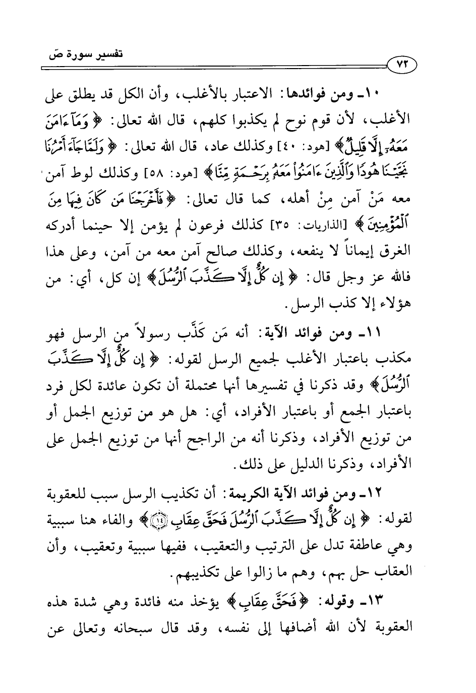 ١٠ - ومن فوائدها: الاعتبار بالأغلب، وأن الكل قد يطلق على الأغلب, لأن قوم نوح لم يكذبوا كلهم، قال الله تعالى: {وَمَا آمَنَ مَعَهُ إِلَّا قَلِيلٌ} [هود: ٤٠] وكذلك عاد، قال الله تعالى: {وَلَمَّا جَاءَ أَمْرُنَا نَجَّيْنَا هُودًا وَالَّذِينَ آمَنُوا مَعَهُ بِرَحْمَةٍ مِنَّا} [هود: ٥٨] وكذلك لوط آمن معه مَنْ آمن مِنْ أهله، كما قال تعالى: {فَأَخْرَجْنَا مَنْ كَانَ فِيهَا مِنَ الْمُؤْمِنِينَ} [الذاريات: ٣٥] كذلك فرعون لم يؤمن إلا حينما أدركه الغرق إيمانًا لا ينفعه، وكذلك صالح آمن معه من آمن، وعلى هذا فالله عَزَّ وَجَلَّ قال: {إِنْ كُلٌّ إِلَّا كَذَّبَ الرُّسُلَ} إن كل، أي: من هؤلاء إلا كذب الرسل.