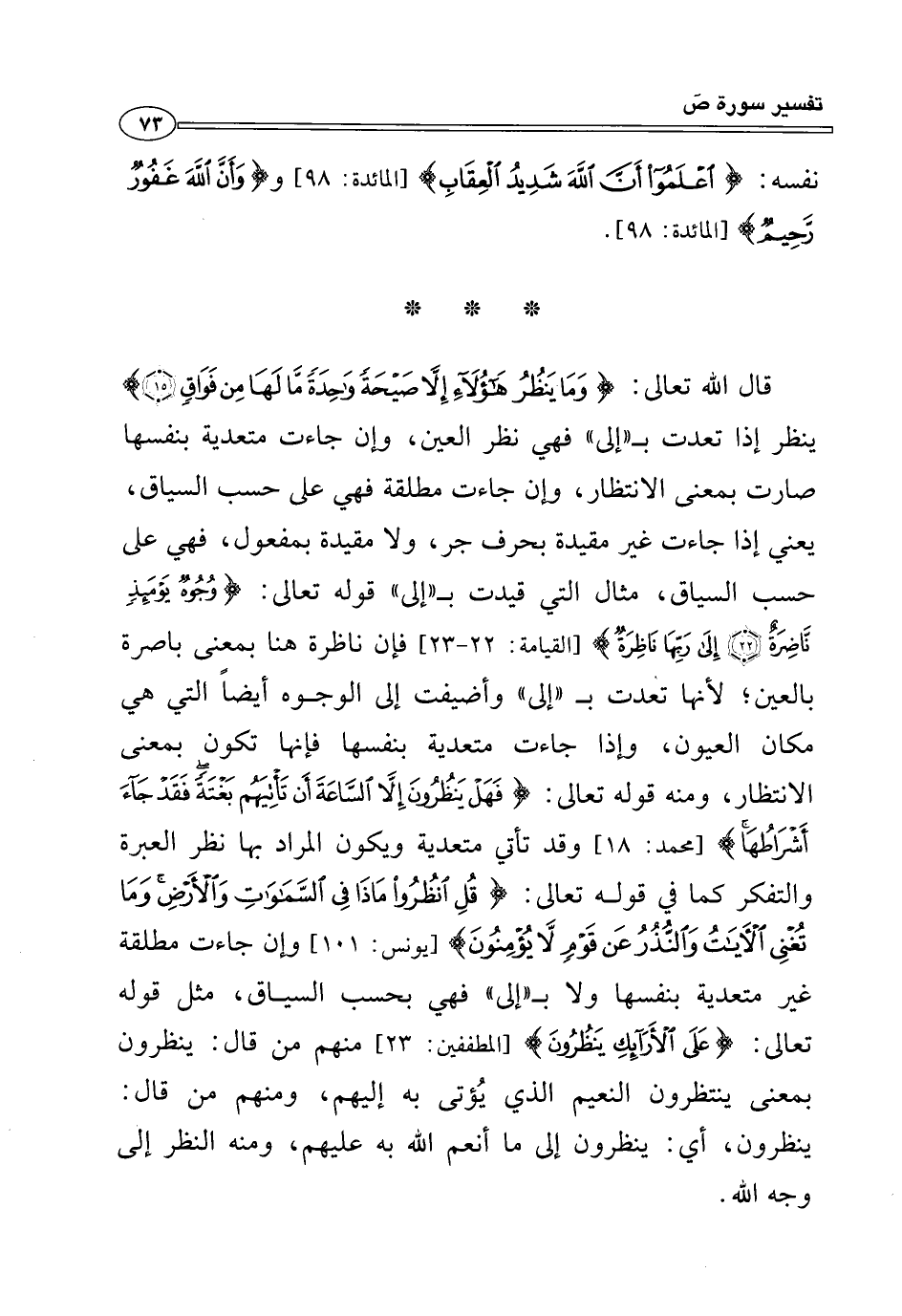 قال الله تعالى: {وَمَا يَنْظُرُ هَؤُلَاءِ إِلَّا صَيْحَةً وَاحِدَةً مَا لَهَا مِنْ فَوَاقٍ (١٥)} ينظر إذا تعدت بـ "إلى" فهي نظر العين، وإن جاءت متعدية بنفسها صارت بمعنى الانتظار، وإن جاءت مطلقة فهي على حسب السياق، يعني إذا جاءت غير مقيدة بحرف جر، ولا مقيدة بمفعول، فهي على حسب السياق، مثال التي قيدت بـ "إلى" قوله تعالى: {وُجُوهٌ يَوْمَئِذٍ نَاضِرَةٌ (٢٢) إِلَى رَبِّهَا نَاظِرَةٌ} [القيامة: ٢٢ - ٢٣] فإن ناظرة هنا بمعنى باصرة بالعين؛ لأنها تعدت بـ "إلى" وأضيفت إلى الوجوه أيضًا التي هي مكان العيون، وإذا جاءت متعدية بنفسها فإنها تكون بمعنى الانتظار، ومنه قوله تعالى: {فَهَلْ يَنْظُرُونَ إِلَّا السَّاعَةَ أَنْ تَأْتِيَهُمْ بَغْتَةً فَقَدْ جَاءَ أَشْرَاطُهَا} [محمد: ١٨] وقد تأتي متعدية ويكون المراد بها نظر العبرة والتفكر كما في قوله تعالى: {قُلِ انْظُرُوا مَاذَا فِي السَّمَاوَاتِ وَالْأَرْضِ وَمَا تُغْنِي الْآيَاتُ وَالنُّذُرُ عَنْ قَوْمٍ لَا يُؤْمِنُونَ} [يونس: ١٠١] وإن جاءت مطلقة غير متعدية بنفسها ولا بـ"إلى" فهي بحسب السياق، مثل قوله تعالى: {عَلَى الْأَرَائِكِ يَنْظُرُونَ} [المطففين: ٢٣] منهم من قال: ينظرون بمعنى ينتظرون النعيم الذي يُؤتى به إليهم، ومنهم من قال: ينظرون، أي: ينظرون إلى ما أنعم الله به عليهم، ومنه النظر إلى وجه الله.