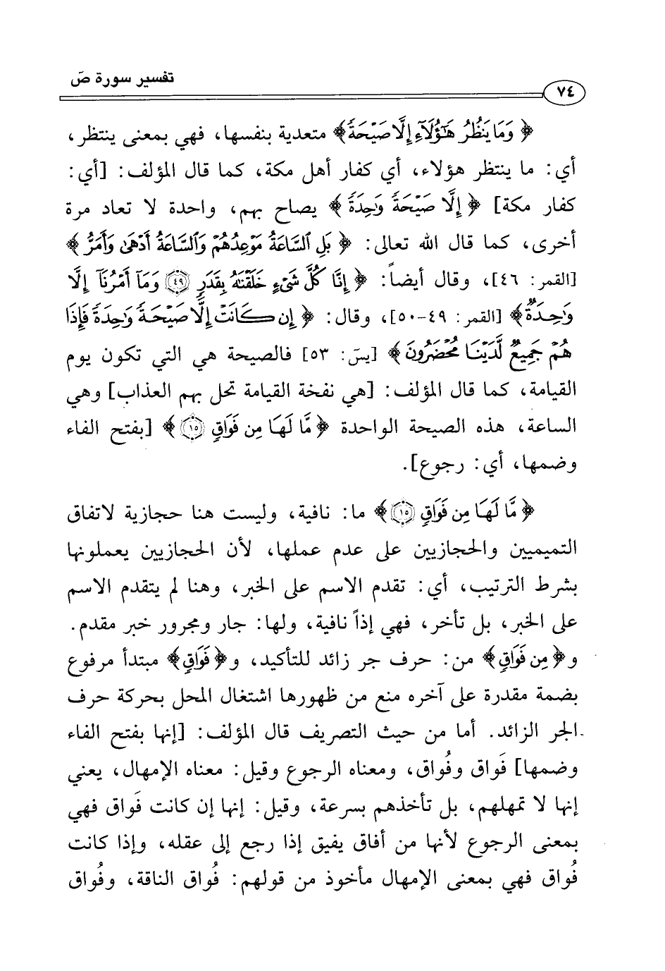 {مَا لَهَا مِنْ فَوَاقٍ (١٥)} ما: نافية، وليست هنا حجازية لاتفاق التميميين والحجازيين على عدم عملها, لأن الحجازيين يعملونها بشرط الترتيب، أي: تقدم الاسم على الخبر، وهنا لم يتقدم الاسم على الخبر، بل تأخر، فهي إذًا نافية، ولها: جار ومجرور خبر مقدم. و {مِنْ فَوَاقٍ} من: حرف جر زائد للتأكيد، و {فَوَاقٍ} مبتدأ مرفوع بضمة مقدرة على آخره منع من ظهورها اشتغال المحل بحركة حرف الجر الزائد. أما من حيث التصريف قال المؤلف: [إنها بفتح الفاء وضمها] فَواق وفُواق، ومعناه الرجوع وقيل: معناه الإمهال، يعني إنها لا تمهلهم، بل تأخذهم بسرعة، وقيل: إنها إن كانت فَواق فهي بمعنى الرجوع لأنها من أفاق يفيق إذا رجع إلى عقله، وإذا كانت فُواق فهي بمعنى الإمهال مأخوذ من قولهم: فُواق الناقة، وفُواق