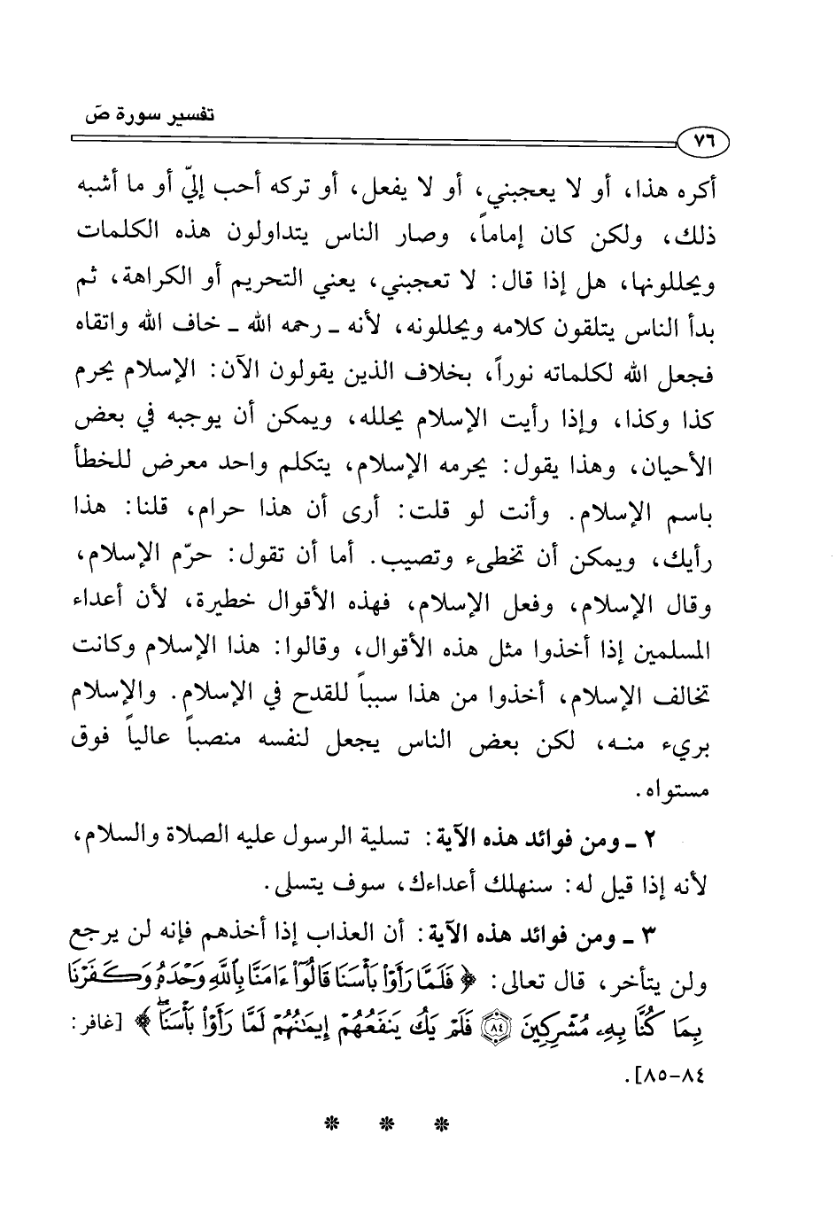 أكره هذا، أو لا يعجبني، أو لا يفعل، أو تركه أحب إليّ أو ما أشبه ذلك، ولكن كان إمامًا، وصار الناس يتداولون هذه الكلمات ويحللونها، هل إذا قال: لا تعجبني، يعني التحريم أو الكراهة، ثم بدأ الناس يتلقون كلامه ويحللونه, لأنه - رحمه الله - خاف الله واتقاه فجعل الله لكلماته نورًا، بخلاف الذين يقولون الآن: الإِسلام يحرم كذا وكذا، وإذا رأيت الإِسلام يحلله، ويمكن أن يوجبه في بعض الأحيان، وهذا يقول: يحرمه الإِسلام، يتكلم واحد معرض للخطأ باسم الإِسلام. وأنت لو قلت: أرى أن هذا حرام، قلنا: هذا رأيك، ويمكن أن تخطئ وتصيب. أما أن تقول: حرّم الإِسلام، وقال الإِسلام، وفعل الإِسلام، فهذه الأقوال خطيرة, لأن أعداء المسلمين إذا أخذوا مثل هذه الأقوال، وقالوا: هذا الإِسلام وكانت تخالف الإِسلام، أخذوا من هذا سببًا للقدح في الإِسلام. والإِسلام بريء منه، لكن بعض الناس يجعل لنفسه منصبًا عاليًا فوق مستواه.