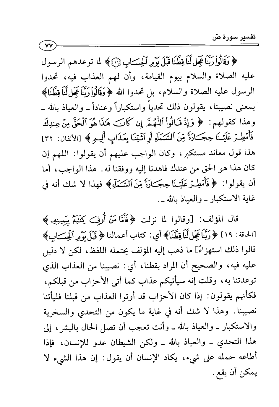 قال المؤلف: [وقالوا لما نزلت {فَأَمَّا مَنْ أُوتِيَ كِتَابَهُ بِيَمِينِهِ} [الحاقة: ١٩] {رَبَّنَا عَجِّلْ لَنَا قِطَّنَا} أي: كتاب أعمالنا {قَبْلَ يَوْمِ الْحِسَابِ} قالوا ذلك استهزاءً] ما ذهب إليه المؤلف يحتمله اللفظ، لكن لا دليل عليه فيه، والصحيح أن المراد بقطنا، أي: نصيبنا من العذاب الذي توعدتنا به، وقلت إنه سيأتيكم عذاب كما أتى الأحزاب من قبلكم، فكأنهم يقولون: إذا كان الأحزاب قد أوتوا العذاب من قبلنا فليأتنا نصيبنا. وهذا لا شك أنه في غاية ما يكون من التحدي والسخرية والاستكبار -والعياذ بالله- وأنت تعجب أن تصل الحال بالبشر، إلى هذا التحدي -والعياذ بالله- ولكن الشيطان عدو للإنسان، فإذا أطاعه حمله على شيء، يكاد الإنسان أن يقول: إن هذا الشيء لا يمكن أن يقع.