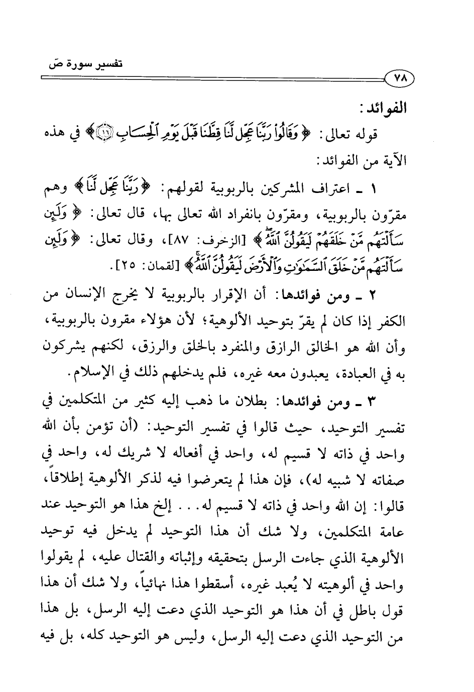 ٣ - ومن فوائدها: بطلان ما ذهب إليه كثير من المتكلمين في تفسير التوحيد، حيث قالوا في تفسير التوحيد: (أن تؤمن بأن الله واحد في ذاته لا قسيم له، واحد في أفعاله لا شريك له، واحد في صفاته لا شبيه له)، فإن هذا لم يتعرضوا فيه لذكر الألوهية إطلاقًا، قالوا: إن الله واحد في ذاته لا قسيم له ... إلخ هذا هو التوحيد عند عامة المتكلمين، ولا شك أن هذا التوحيد لم يدخل فيه توحيد الألوهية الذي جاءت الرسل بتحقيقه وإثباته والقتال عليه، لم يقولوا واحد في ألوهيته لا يُعبد غيره، أسقطوا هذا نهائيًا، ولا شك أن هذا قول باطل في أن هذا هو التوحيد الذي دعت إليه الرسل، بل هذا من التوحيد الذي دعت إليه الرسل، وليس هو التوحيد كله، بل فيه