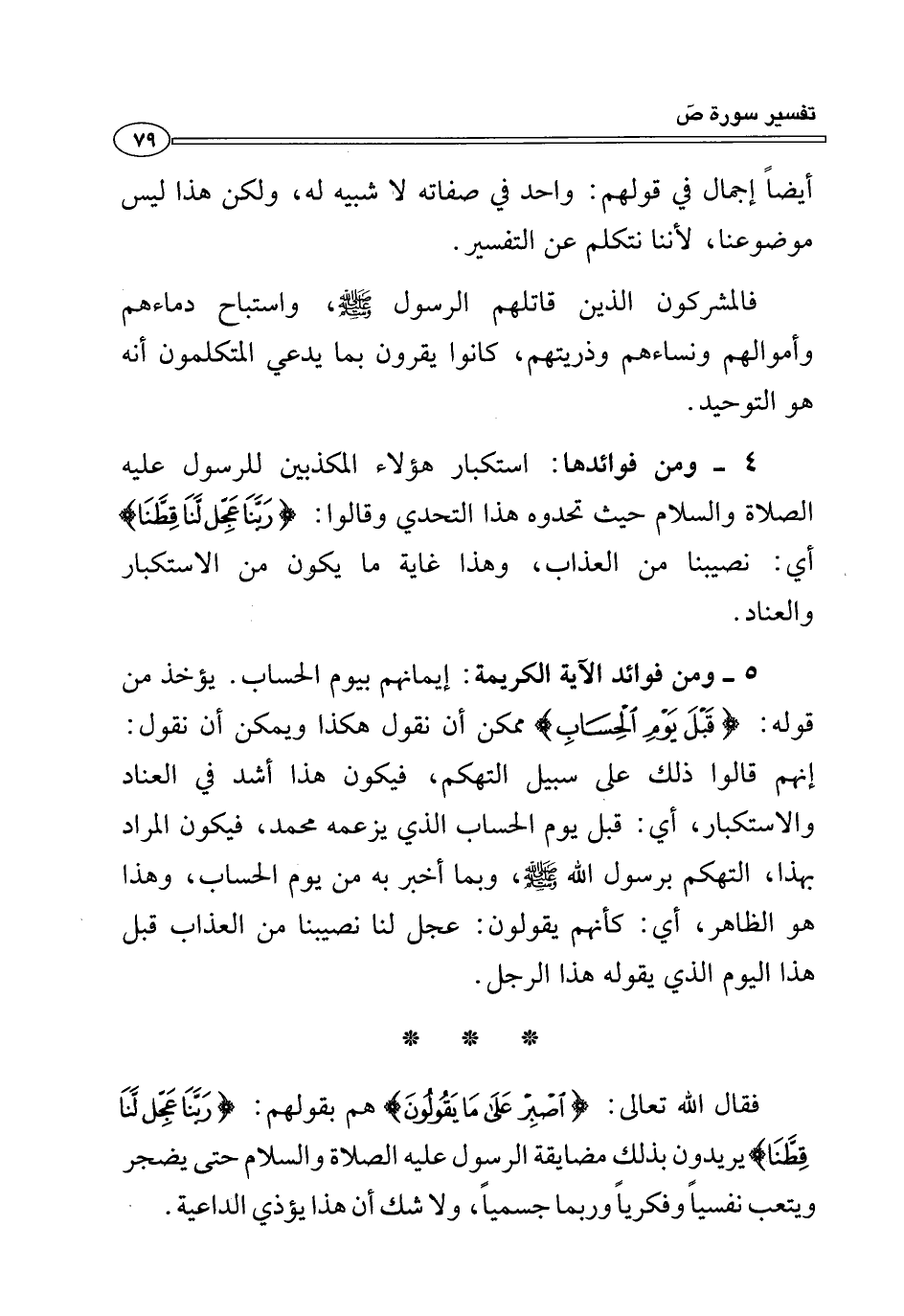 ٥ - ومن فوائد الآية الكريمة: إيمانهم بيوم الحساب. يؤخذ من قوله: {قَبْلَ يَوْمِ الْحِسَابِ} ممكن أن نقول هكذا ويمكن أن نقول: إنهم قالوا ذلك على سبيل التهكم، فيكون هذا أشد في العناد والاستكبار، أي: قبل يوم الحساب الذي يزعمه محمَّد، فيكون المراد بهذا، التهكم برسول الله - صلى الله عليه وسلم -، وبما أخبر به من يوم الحساب، وهذا هو الظاهر، أي: كأنهم يقولون: عجل لنا نصيبنا من العذاب قبل هذا اليوم الذي يقوله هذا الرجل.