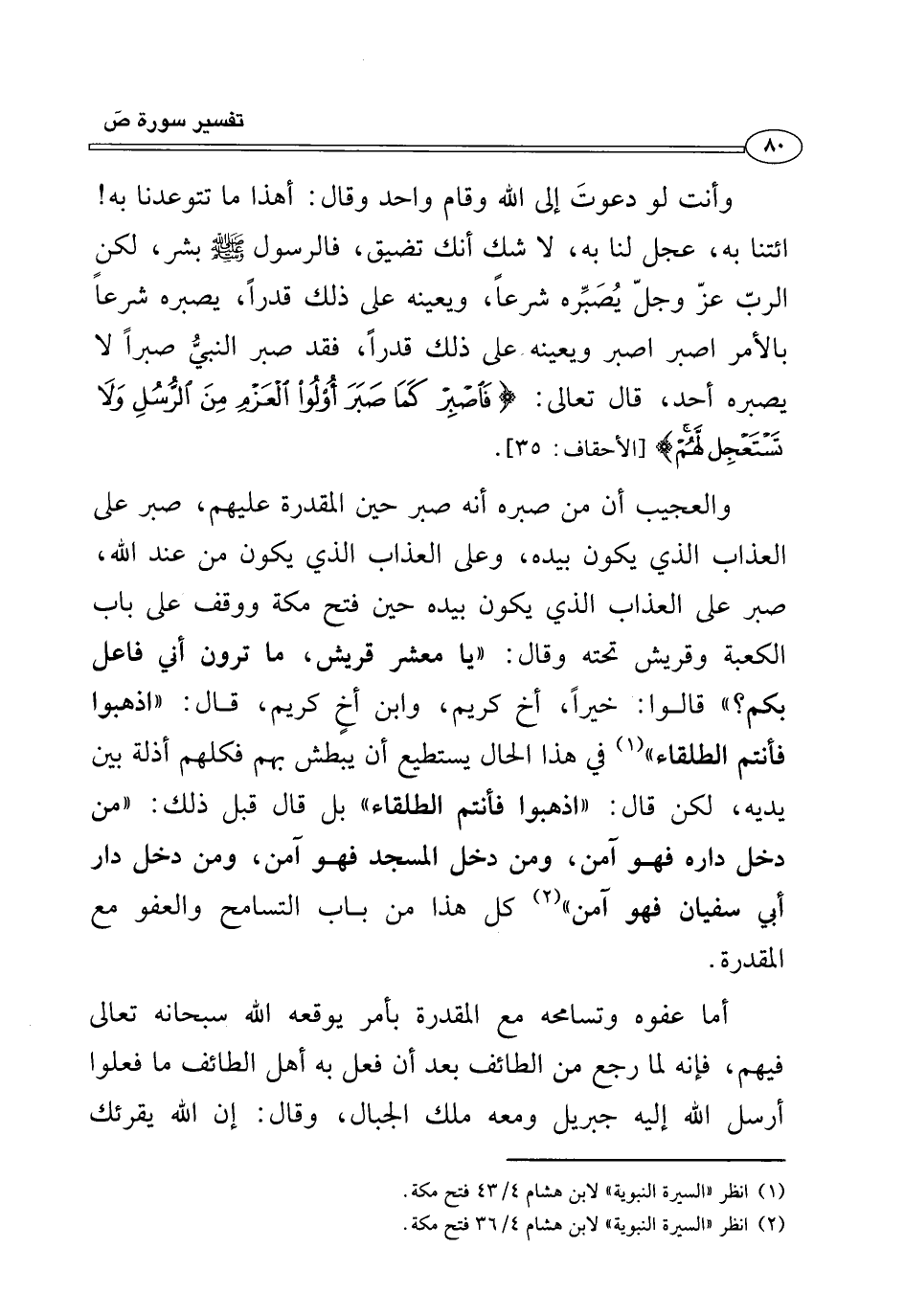والعجيب أن من صبره أنه صبر حين المقدرة عليهم، صبر على العذاب الذي يكون بيده، وعلى العذاب الذي يكون من عند الله، صبر على العذاب الذي يكون بيده حين فتح مكة ووقف على باب الكعبة وقريش تحته وقال: "يا معشر قريش، ما ترون أني فاعل بكم؟ " قالوا: خيرًا، أخ كريم، وابن أخٍ كريم، قال: "اذهبوا فأنتم الطلقاء" (¬١) في هذا الحال يستطيع أن يبطش بهم فكلهم أذلة بين يديه، لكن قال: "اذهبوا فأنتم الطلقاء" بل قال قبل ذلك: "من دخل داره فهو آمن، ومن دخل المسجد فهو آمن، ومن دخل دار أبي سفيان فهو آمن" (¬٢) كل هذا من باب التسامح والعفو مع المقدرة.