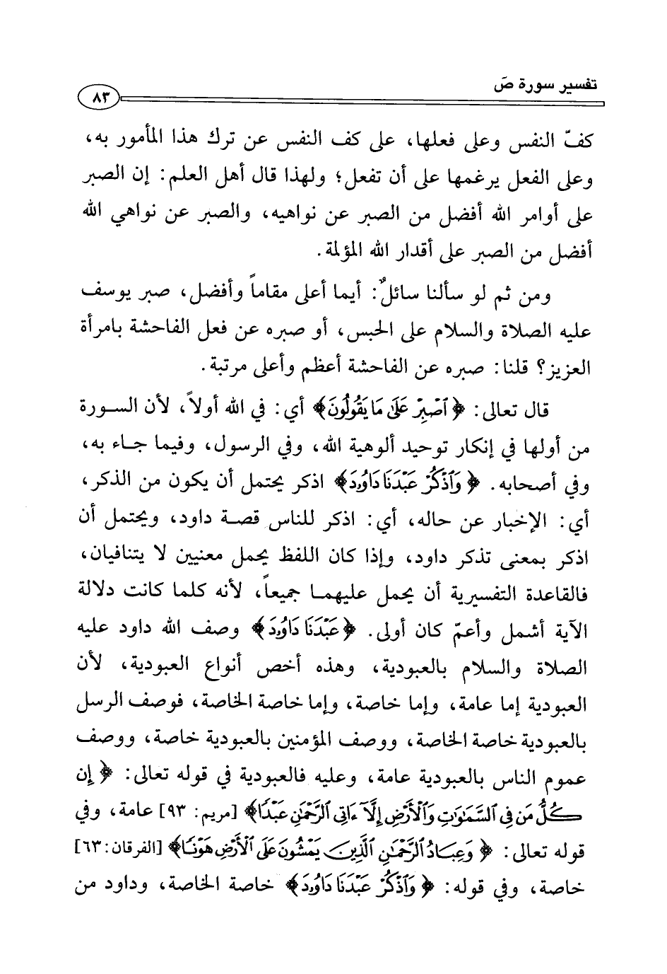 قال تعالى: {اصْبِرْ عَلَى مَا يَقُولُونَ} أي: في الله أولًا, لأن السورة من أولها في إنكار توحيد ألوهية الله، وفي الرسول، وفيما جاء به، وفي أصحابه. {وَاذْكُرْ عَبْدَنَا دَاوُودَ} اذكر يحتمل أن يكون من الذكر، أي: الإخبار عن حاله، أي: اذكر للناس قصة داود، ويحتمل أن اذكر بمعنى تذكر داود، وإذا كان اللفظ يحمل معنيين لا يتنافيان، فالقاعدة التفسيرية أن يحمل عليهما جميعًا, لأنه كلما كانت دلالة الآية أشمل وأعمّ كان أولى. {عَبْدَنَا دَاوُودَ} وصف الله داود عليه الصلاة والسلام بالعبودية، وهذه أخص أنواع العبودية, لأن العبودية إما عامة، وإما خاصة، وإما خاصة الخاصة، فوصف الرسل بالعبودية خاصة الخاصة، ووصف المؤمنين بالعبودية خاصة، ووصف عموم الناس بالعبودية عامة، وعليه فالعبودية في قوله تعالى: {إِنْ كُلُّ مَنْ فِي السَّمَاوَاتِ وَالْأَرْضِ إِلَّا آتِي الرَّحْمَنِ عَبْدًا} [مريم: ٩٣] عامة، وفي قوله تعالى: {وَعِبَادُ الرَّحْمَنِ الَّذِينَ يَمْشُونَ عَلَى الْأَرْضِ هَوْنًا} [الفرقان: ٦٣] خاصة، وفي قوله: {وَاذْكُرْ عَبْدَنَا دَاوُودَ} خاصة الخاصة، وداود من
