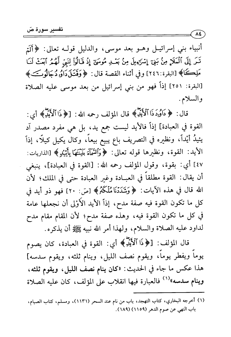قال المؤلف: [{ذَا الْأَيْدِ} أي: القوة في العبادة، كان يصوم يومًا ويفطر يومًا، ويقوم نصف الليل، وينام ثلثه، ويقوم سدسه] هذا عكس ما جاء في الحديث: "كان ينام نصف الليل، ويقوم ثلثه، وينام سدسه" (¬١) فالعبارة فيها انقلاب على المؤلف، كان عليه الصلاة