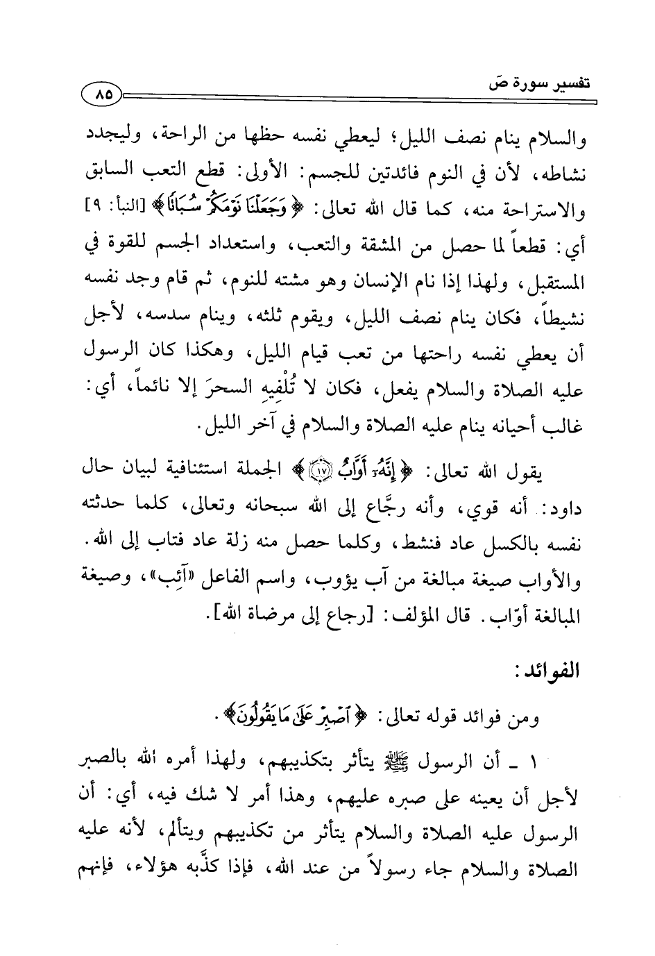 يقول الله تعالى: {إِنَّهُ أَوَّابٌ (١٧)} الجملة استئنافية لبيان حال داود: أنه قوي، وأنه رجَّاع إلى الله سبحانه وتعالى، كلما حدثته نفسه بالكسل عاد فنشط، وكلما حصل منه زلة عاد فتاب إلى الله. والأواب صيغة مبالغة من آب يؤوب، واسم الفاعل "آئِب"، وصيغة المبالغة أوّاب. قال المؤلف: [رجاع إلى مرضاة الله].