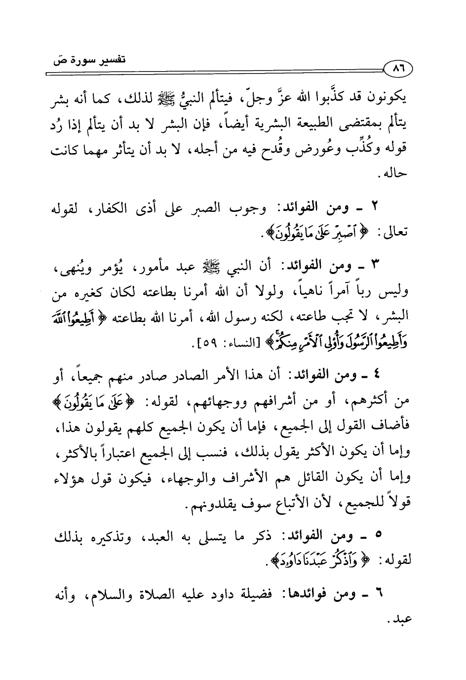 ٣ - ومن الفوائد: أن النبي - صلى الله عليه وسلم - عبد مأمور, يُؤمر ويُنهى، وليس ربًا آمرًا ناهيًا، ولولا أن الله أمرنا بطاعته لكان كغيره من البشر، لا تجب طاعته، لكنه رسول الله، أمرنا الله بطاعته {أَطِيعُوا اللَّهَ وَأَطِيعُوا الرَّسُولَ وَأُولِي الْأَمْرِ مِنْكُمْ} [النساء: ٥٩].