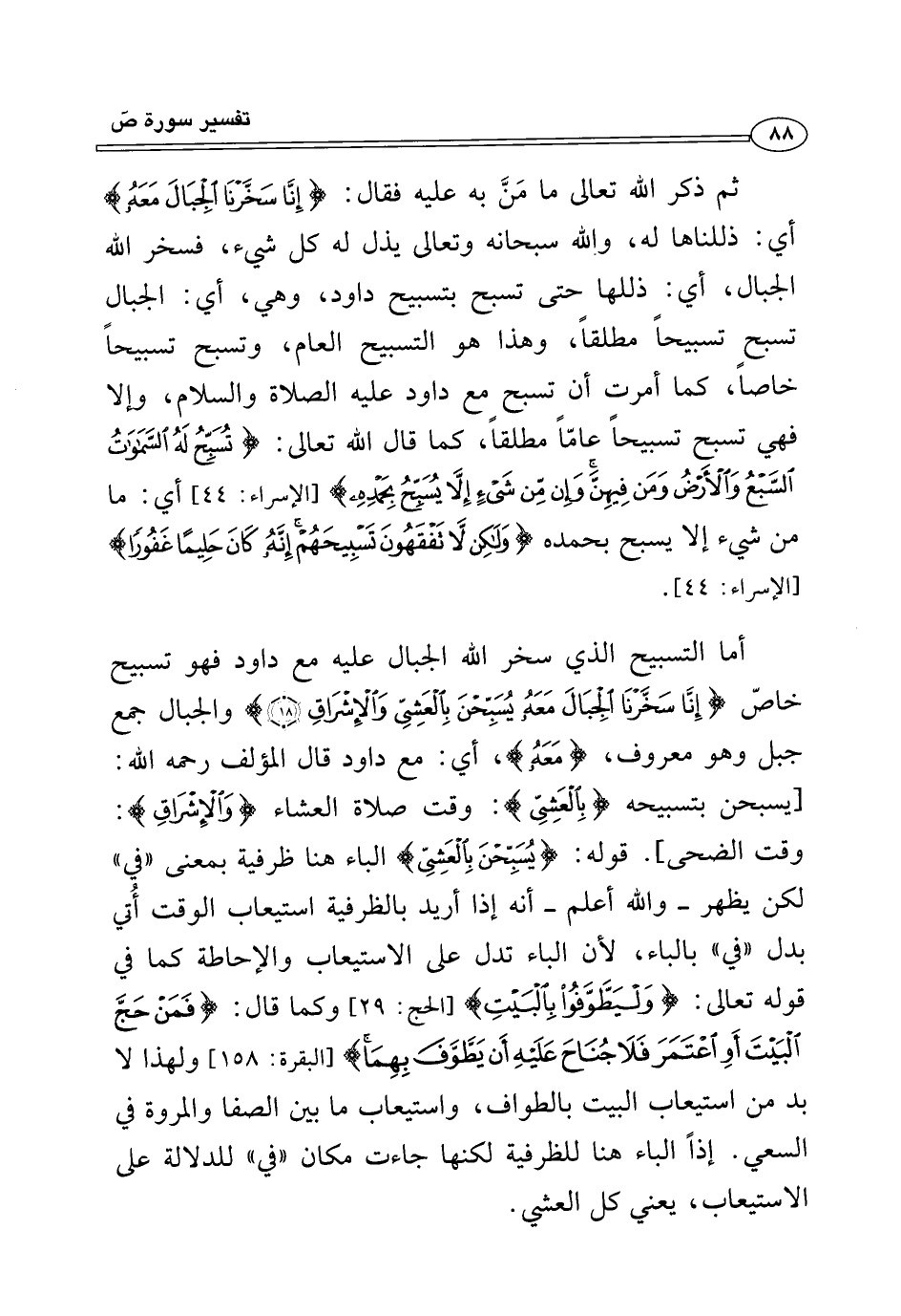أما التسبيح الذي سخر الله الجبال عليه مع داود فهو تسبيح خاصّ {إِنَّا سَخَّرْنَا الْجِبَالَ مَعَهُ يُسَبِّحْنَ بِالْعَشِيِّ وَالْإِشْرَاقِ (١٨)} والجبال جمع جبل وهو معروف، {مَعَهُ}، أي: مع داود قال المؤلف رحمه الله: [يسبحن بتسبيحه {بِالْعَشِيِّ}: وقت صلاة العشاء {وَالْإِشْرَاقِ}: وقت الضحى]. قوله: {يُسَبِّحْنَ بِالْعَشِيِّ} الباء هنا ظرفية بمعنى "في" لكن يظهر- والله أعلم- أنه إذا أريد بالظرفية استيعاب الوقت أُتي بدل "في" بالباء, لأن الباء تدل على الاستيعاب والإحاطة كما في قوله تعالى: {وَلْيَطَّوَّفُوا بِالْبَيْتِ} [الحج: ٢٩] وكما قال: {فَمَنْ حَجَّ الْبَيْتَ أَوِ اعْتَمَرَ فَلَا جُنَاحَ عَلَيْهِ أَنْ يَطَّوَّفَ بِهِمَا} [البقرة: ١٥٨] ولهذا لا بد من استيعاب البيت بالطواف، واستيعاب ما بين الصفا والمروة في السعي. إذًا الباء هنا للظرفية لكنها جاءت مكان "في" للدلالة على الاستيعاب، يعني كل العشي.