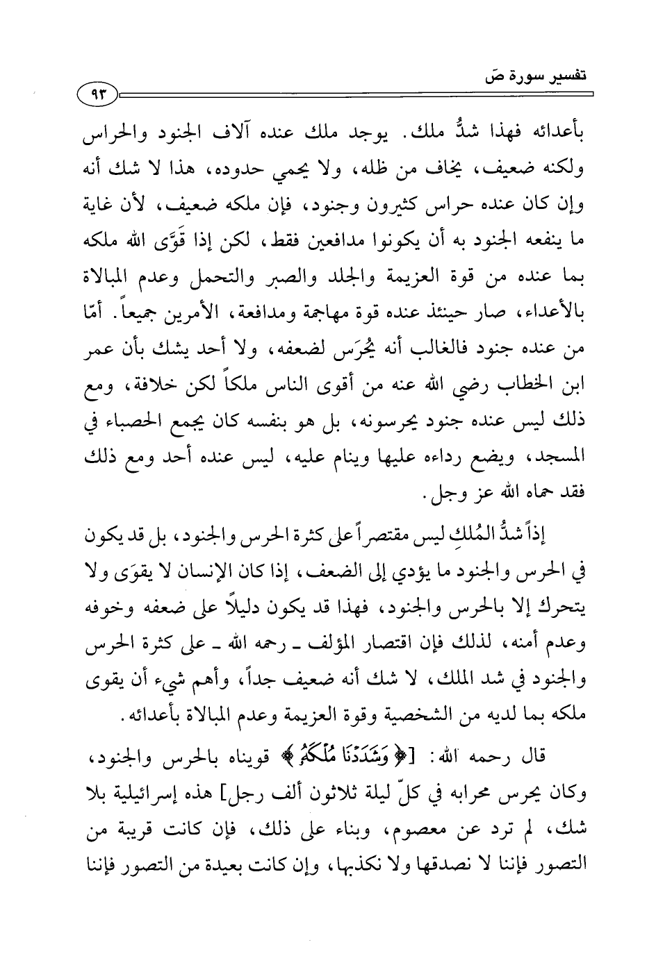 قال رحمه الله: {وَشَدَدْنَا مُلْكَهُ} قويناه بالحرس والجنود، وكان يحرس محرابه في كلّ ليلة ثلاثون ألف رجل] هذه إسرائيلية بلا شك، لم ترد عن معصوم، وبناء على ذلك، فإن كانت قريبة من التصور فإننا لا نصدقها ولا نكذبها، وإن كانت بعيدة من التصور فإننا
