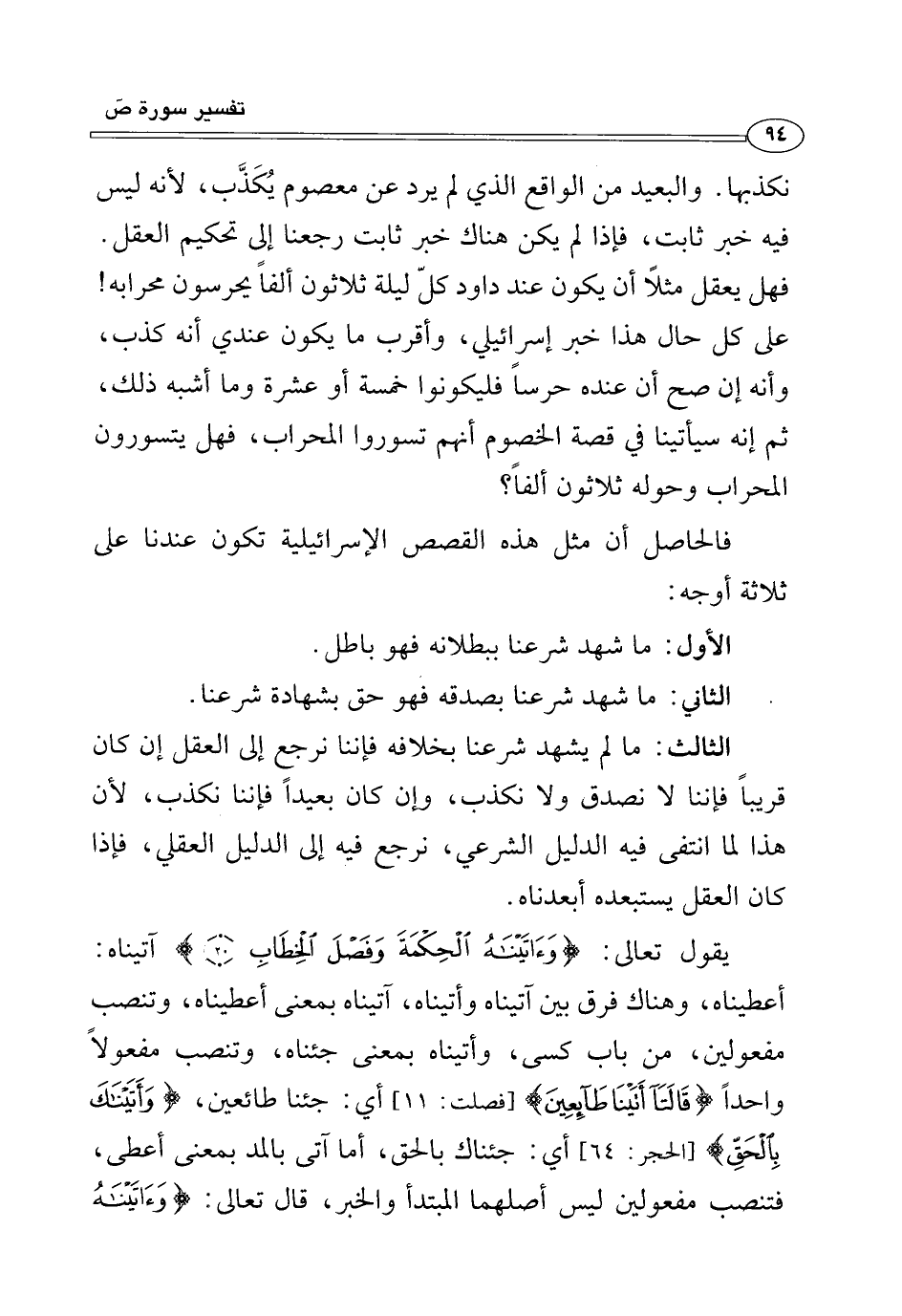 نكذبها. والبعيد من الواقع الذي لم يرد عن معصوم يُكَذَّب, لأنه ليس فيه خبر ثابت، فإذا لم يكن هناك خبر ثابت رجعنا إلى تحكيم العقل. فهل يعقل مثلًا أن يكون عند داود كلّ ليلة ثلاثون ألفًا يحرسون محرابه! على كل حال هذا خبر إسرائيلي، وأقرب ما يكون عندي أنه كذب، وأنه إن صح أن عنده حرسًا فليكونوا خمسة أو عشرة وما أشبه ذلك، ثم إنه سيأتينا في قصة الخصوم أنهم تسوروا المحراب، فهل يتسورون المحراب وحوله ثلاثون ألفًا؟