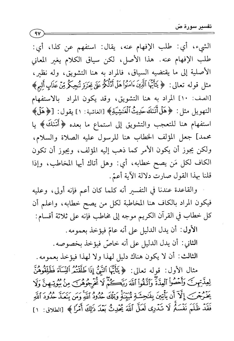 الشيء، أي: طلب الإفهام عنه، يقال: استفهم عن كذا، أي: طلب الإفهام عنه. هذا الأصل، لكن سياق الكلام يغير المعاني الأصلية إلى ما يقتضيه السياق، فالمراد به هنا التشويق، وله نظير، مثل قوله تعالى: {يَاأَيُّهَا الَّذِينَ آمَنُوا هَلْ أَدُلُّكُمْ عَلَى تِجَارَةٍ تُنْجِيكُمْ مِنْ عَذَابٍ أَلِيمٍ} [الصف: ١٠] المراد به هنا التشويق، وقد يكون المراد بالاستفهام التهويل مثل: {هَلْ أَتَاكَ حَدِيثُ الْغَاشِيَةِ} [الغاشية: ١] يقول: [{هَلْ} استفهام هنا للتعجب والتشويق إلى استماع ما بعده {أَتَاكَ} يا محمَّد] جعل المؤلف الخطاب هنا للرسول عليه الصلاة والسلام، ولكن يجوز أن يكون الأمر كما ذهب إليه المؤلف، ويجوز أن تكون الكاف لكل مَن يصح خطابه، أي: وهل أتاك أيها المخاطب، وإذا قلنا بهذا القول صارت دلالة الآية أعمّ.
