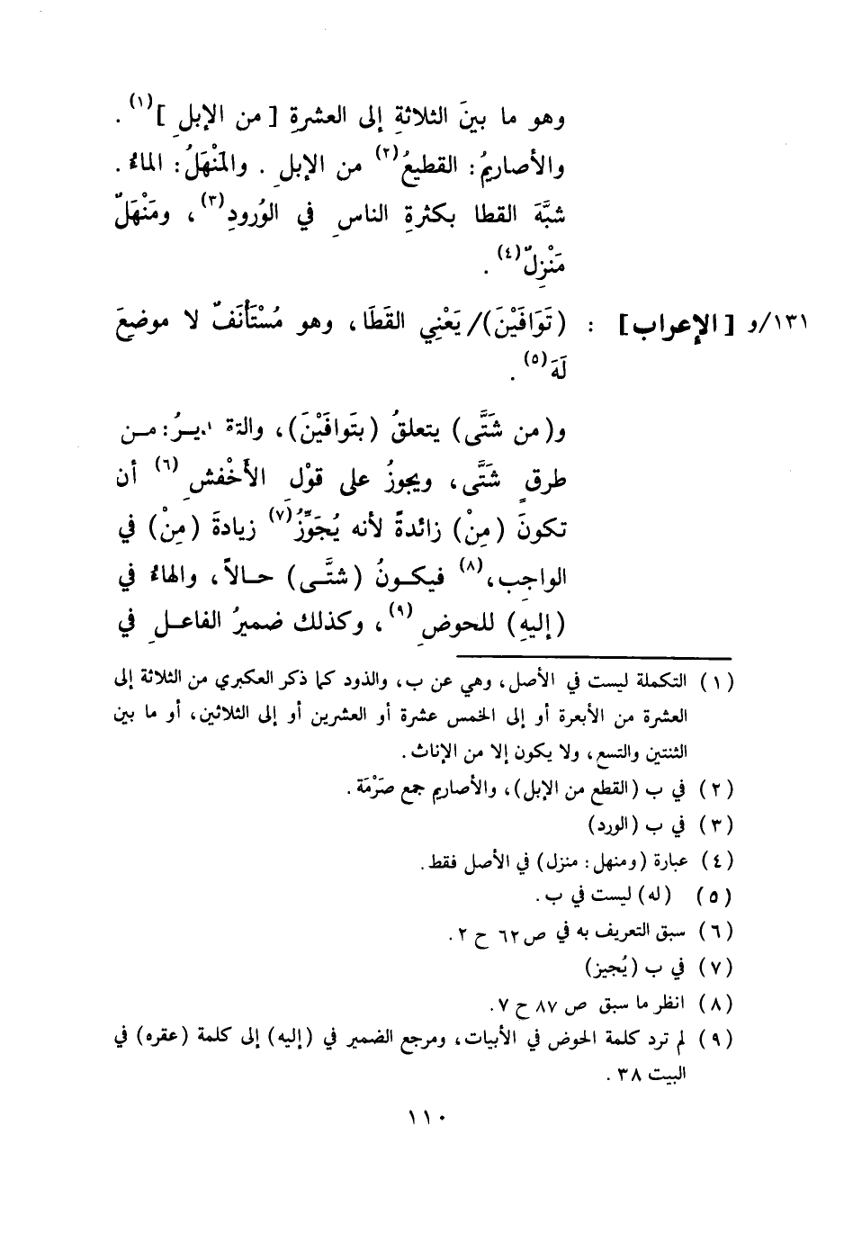 و (من شَتَّى) يتَعَلَّق (بتوافين) ، وَالتَّقْدِير: من طرق شَتَّى، وَيجوز على قَول الْأَخْفَش أَن تكون (من) زَائِدَة لِأَنَّهُ يجوز زِيَادَة (من) فِي الْوَاجِب، فَيكون (شَتَّى) حَالا، وَالْهَاء فِي (إِلَيْهِ) للحوض، وَكَذَلِكَ ضمير الْفَاعِل فِي
