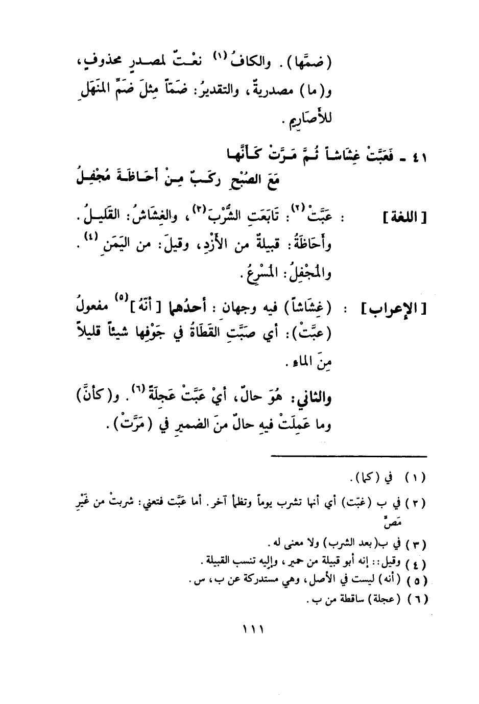 [الْإِعْرَاب] : (غشاشا) فِيهِ وَجْهَان: أَحدهمَا [أَنه] مفعول (عبت) أَي: صبَّتْ القطاة فِي جوفها شَيْئا قَلِيلا من المَاء.