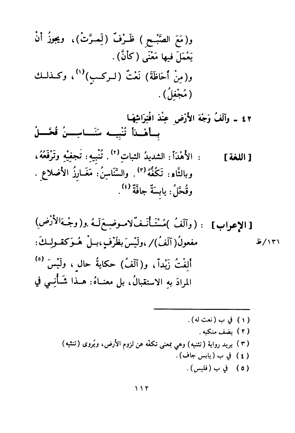 و (وَجه الأَرْض) مفعول (آلف) ، وَلَيْسَ بظرف، بل هُوَ كَقَوْلِك: ألفت زيدا، و (آلف) حِكَايَة حَال، وَلَيْسَ المُرَاد بِهِ الِاسْتِقْبَال، بل مَعْنَاهُ: هَذَا شأني فِي