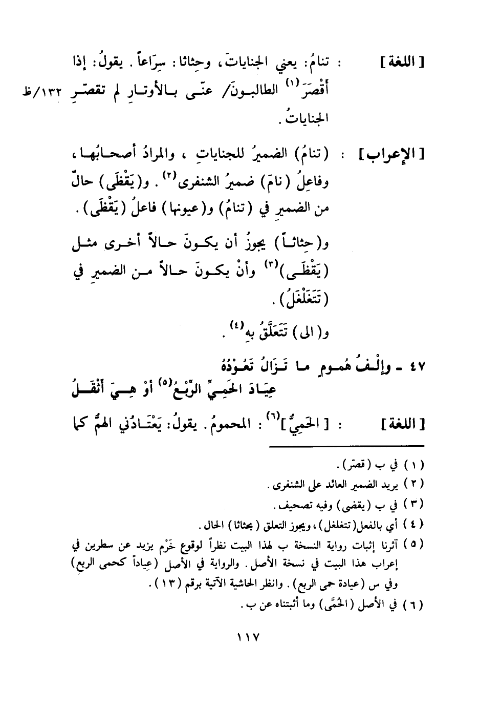 [الْإِعْرَاب] : (تنام) الضَّمِير للجنايات، وَالْمرَاد أَصْحَابهَا، وفاعل (نَام) ضمير الشنفرى.
