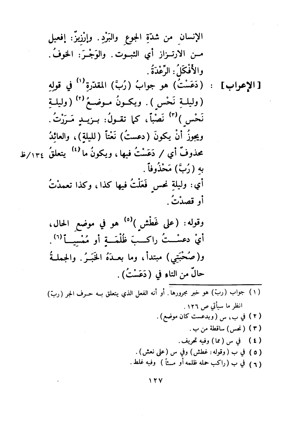 [الْإِعْرَاب] : (دعست) هُوَ جَوَاب (رب) الْمقدرَة فِي قَوْله (وَلَيْلَة نحس) .