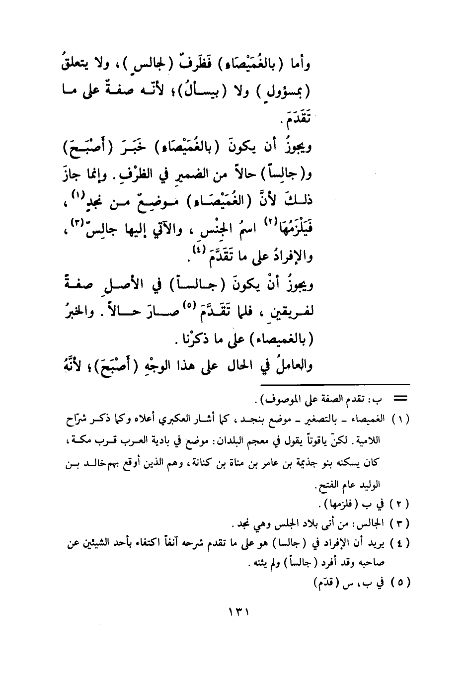 وَيجوز أَن يكون (بالغميصاء) خبر (أصبح) و (جَالِسا) حَالا من الضَّمِير فِي الظّرْف.