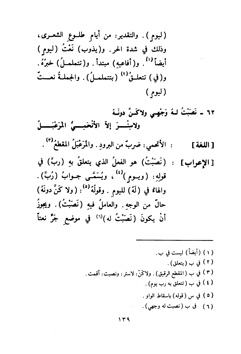 [الْإِعْرَاب] : (نصبت) هُوَ الْفِعْل الَّذِي يتَعَلَّق بِهِ (رب) فِي قَوْله: (وَيَوْم) ، وَيُسمى جَوَاب (رب) .