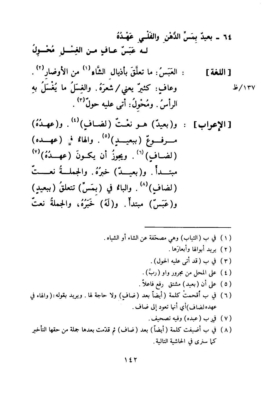 64 - (بعيد بِمَسّ الدّهن والفلي عَهده ... لَهُ عبس عاف من الْغسْل محول)