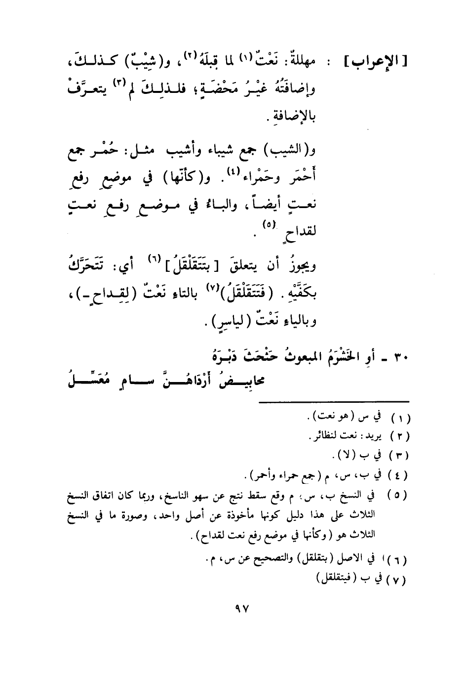 [الْإِعْرَاب] : مهللة: نعت لما قبله، و (شيب) كَذَلِك، وإضافته غير مَحْضَة فَلذَلِك لم يتعرف بِالْإِضَافَة.