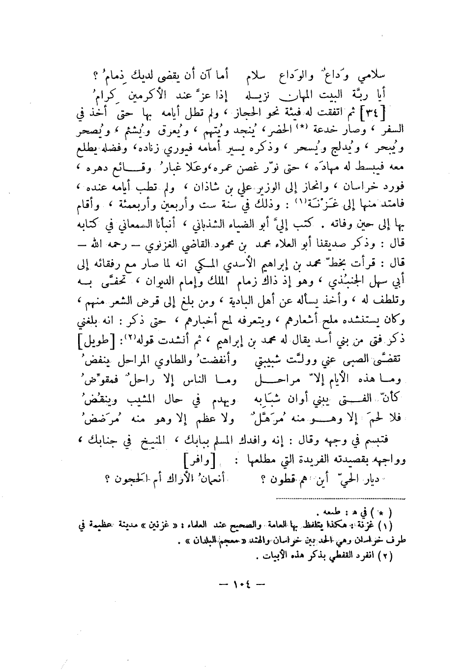 ثم اتفقت له فيئة نحو الحجاز، ولم تطل أيامه بها حتى أخذ في السفر، وصار خدعة الحضر، يُنجد ويُتهم، ويُعرق ويُشئم، ويُصحر ويُبحر، ويُدلج ويُسحر، وذكره يسير أمامه فيوري زناده، وفضله يطلع معه فيبسط له مهادَه، حتى نوّر غصن عمره، وعَلا غُبار وقائع دهره، فورد خراسان، وانحاز إلى الوزير علي بن شاذان، ولم تطب أيامه عنده، فامتد منها إلى غَزْنَة: وذلك في سنة ست وأربعين وأربعمئة، وأقام بها إلى حين وفاته. كتب إليّ أبو الضياء الشذباني، أنبأنا السمعاني في كتابه قال: وذكر صديقنا أبو العلاء محمد بن محمود القاضي الغزنوي - رحمه الله - قال: قرأت بخطّ محمد بن إبراهيم الأسدي المكي أنه لما صار مع رفقائه إلى أبي سهل الجنبُذي، وهو إذ ذاك زمام الملك وإمام الديوان، تحفَّى به وتلطف له، وأخذ يسأله عن أهل البادية، ومن بلغ إلى قرض الشعر منهم، وكان يستنشده ملح أشعارهم، ويتعرفه لمح أخبارهم، حتى ذكر: أنه بلغني ذكر فتى من بني أسد يقال له محمد بن إبراهيم، ثم أنشدت قوله: طويل: