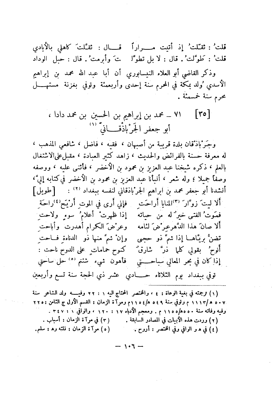 أبو جعفر الجَرْباذْقانيّ وجَرْباذْقان بلدة قريبة من أصبهان، فقيه، فاضل، شافعي المذهب، له معرفة حسنة بالفرائض والحديث، زاهد كثير العبادة، مقبل على الاشتغال بالعلم، ذكره شيخنا عبد العزيز بن محمود بن الأخضر، فأثنى عليه، ووصفه وصفاً جميلاً، وله شعر، أنبأنا عبد العزيز بن محمد بن الأخضر في كتابه إليَّ، أنشدنا أبو جعفر محمد بن إبراهيم الجرْباذقاني لنفسه ببغداد: طويل: