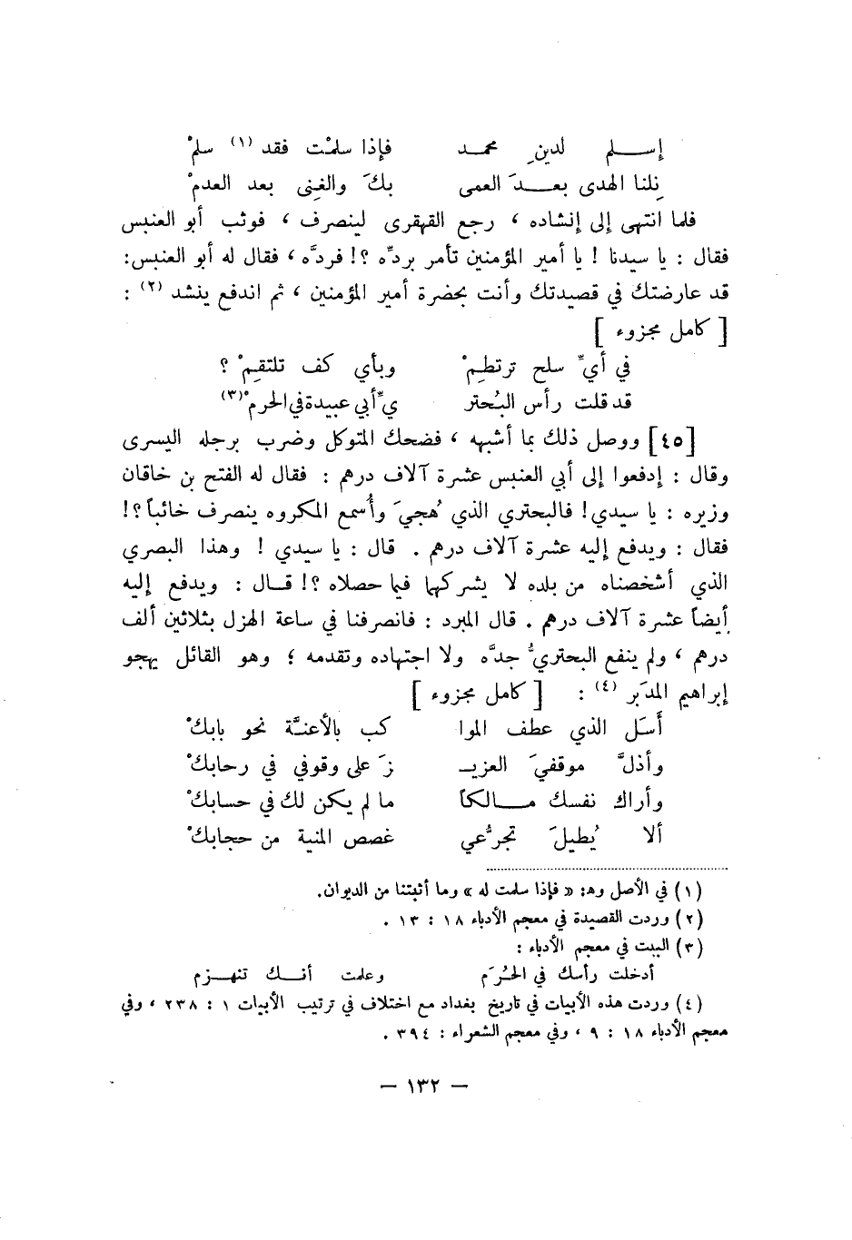 ووصل ذلك بما أشبهه، فضحك المتوكل وضرب برجله اليسرى وقال: إدفعوا إلى أبا العنبس عشرة آلاف درهم: فقال له الفتح في خاقان وزيره: يا سيدي! فالبحتري الذي هُجيَ وأُسمع المكروه ينصرف خائباً؟! فقال: ويدفع إليه عشرة آلاف درهم. قال: يا سيدي! وهذا البصري الذي أشخصناه من بلده لا يشركهما فيما حصلاه؟! قال: ويدفع إليه أيضاً عشرة آلاف درهم. قال المبرد: فانصرفنا في ساعة الهزل بثلاثين ألف درهم، ولم ينفع البحتري جدّه ولا اجتهاده وتقدمه؛ وهو القائل يهجو إبراهيم المدَبر: كامل مجزوء: