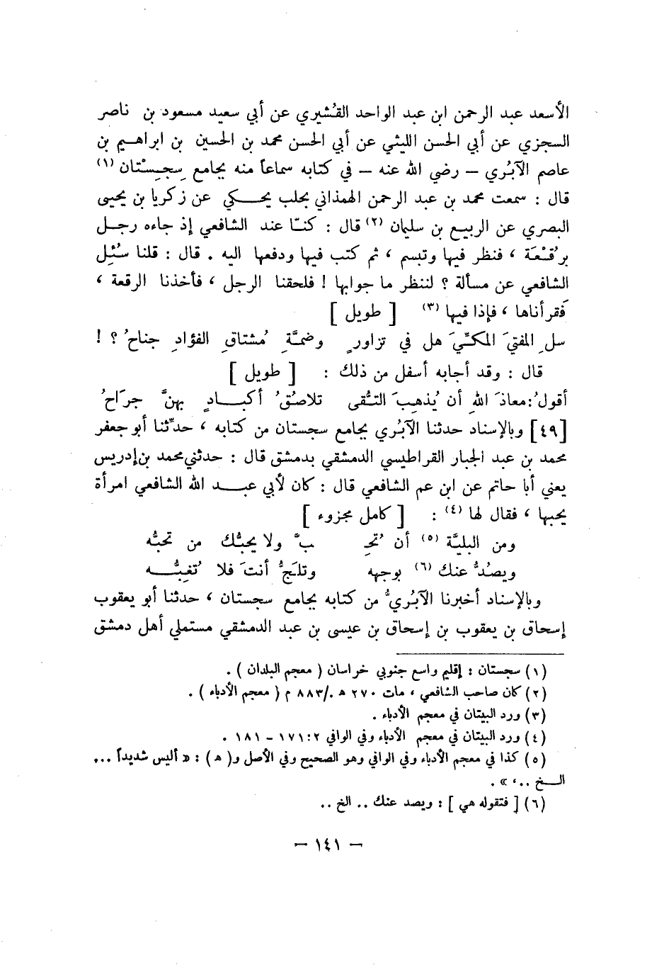 الأسعد عبد الرحمن ابن عبد الواحد القشيري عن أبي سعيد مسعود بن ناصر السجزي عن أبي الحسن الليثي عن أبي الحسن محمد بن الحسين بن إبراهيم بن عاصم الآبري - رضي الله عنه - في كتابه سماعاً منه بجامع سِجِسْتان قال: سمعت محمد بن عبد الرحمن الهمذاني بحلب يحكي عن زكريا بن يحيى البصري عن الربيع بن سليمان قال: كنّا عند الشافعي إذ جاءه رجل برُقْعَة، فنظر فيها وتبسم، ثم كتب فيها ودفعها إليه. قال: قلنا سُئِل الشافعي عن مسألة؟ لننظر ما جوابها! فلحقنا الرجل، فأخذنا الرقعة، فقرأناها، فإذا فيها: طويل: