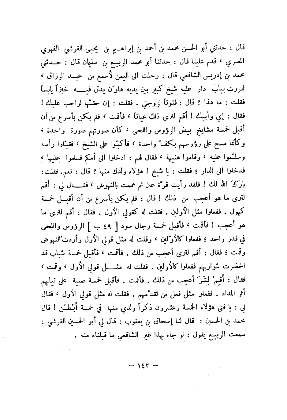 قال: حدثني أبو الحسن محمد بن أحمد بن إبراهيم بن يحيى القرشي الفهري المصري، قدم علينا قال: حدثنا أبو محمد الربيع بن سلمان قال: حدثني محمد بن إدريس الشافعي قال: رحلت إلى اليمن لأسمع من عبد الرزاق، فمررت بباب دار عليه شيخ كبير بين يديه هاوَن يدق فيه خبزاً يابساً فقلت: ما هذا؟ قال: فتوتاً لزوجتي. فقلت: إن حقَّها لواجب عليك! فقال: إي وأبيك! أقم لترى ذلك عياناً، فأقمت، فلم يكن بأسرع من أن أقبل خمسة مشايخ بيض الرؤوس واللحى، كأن صورتهم صورة واحدة، وكأانما مسح على رؤوسهم بكفّ واحدة، فأكبّوا على الشيخ، فقبّلوا رأسه وسلّموا عليه، وقاموا هنيهة، فقال لهم: ادخلوا إلى أمكم فسلموا عليها، فدخلوا إلى الدار، فقلت: يا شيخ! هؤلاء ولدك منها؟ قال: نعم. فقلت: بارك الله لك! فلقد رأيت قرَّة عين ثم هممت بالنهوض، فقال لي: أقم لترى ما هو أعجب من ذلك! قال: فلم يكن بأسرع من أن أقبل خمسة كهول. ففعلوا مثل الأولين. فقلت له كقولي الأول. فقال: أقم لترى ما هو أعجب! فأقمت، فأقبل خمسة رجال سود الرؤوس واللحى في قدر واحد، ففعلوا كالأولين، وقلت له مثل قولي الأول وأردتُ النهوض وقم؛ فقال: أقم لترى أعجب من ذلك. فأقمت، فأقبل خمسة شباب قد اخضرت شواربهم ففعلوا كالأولين فقلت له مثل قولي الأول، وقمت، فقال: أقِمْ لِتَرَ أعجب من ذلك. فأقمتْ. فأقبل خمسة صبية على ثيابهم أثر المداد. ففعلوا مثل فعل من تقدَّمهم. فقلت له مثل قولي الأول، فقال لي: يا فتى هؤلاء الخمسة وعشرون ذكراً ولدي منها في خمسة أبطُن! قال محمد في الحسين: قال لنا إسحاق بن يعقوب: قال لي أبو الحسين القرشي: سمعت الربيع يقول: لو جاء بهذا غير الشافعي ما قبلناه منه.