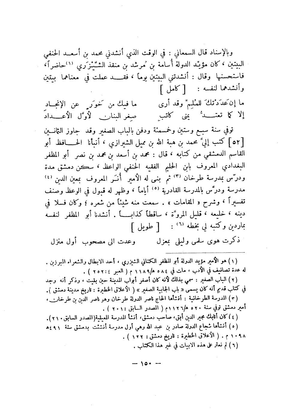 وبالإسناد قال السمعاني: في الوقت الذي أنشدني محمد بن أسعد الحنفي البيتين، كان مؤيِّد الدولة أُسامة بن مُرشد بن منقذ الشَّيْزَري حاضراً، فاستحسنها وقال: أنشدتني البيتين يوماً، فقد عملت في معناهما بيتين وأنشدهما لنفسه: كامل:
