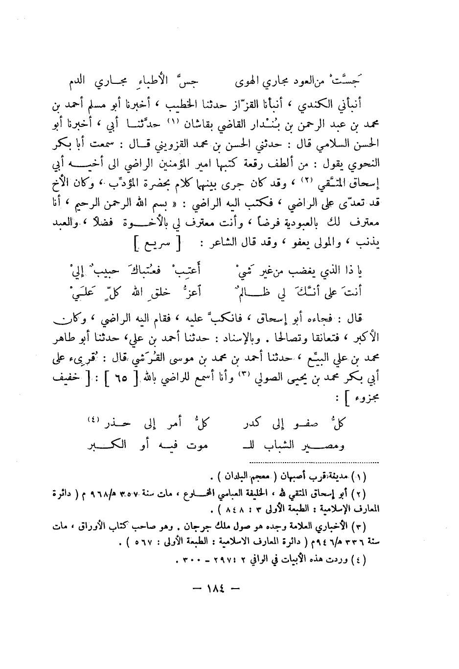 قال: فجاءه أبو إسحاق، فانكبَّ عليه، فقام إليه الراضي، وكان الأكبر، فتعانقا وتصالحا. وبالإسناد: حدثنا أحمد بن علي، حدثنا أبو طاهر محمد بن علي البيِّع، حدثنا أحمد بن محمد بن موسى القُرَشي قال: قُرِىء على أبي بكر محمد بن يحيى الصولي وأنا أسمع للراضي بالله: خفيف مجزوء: