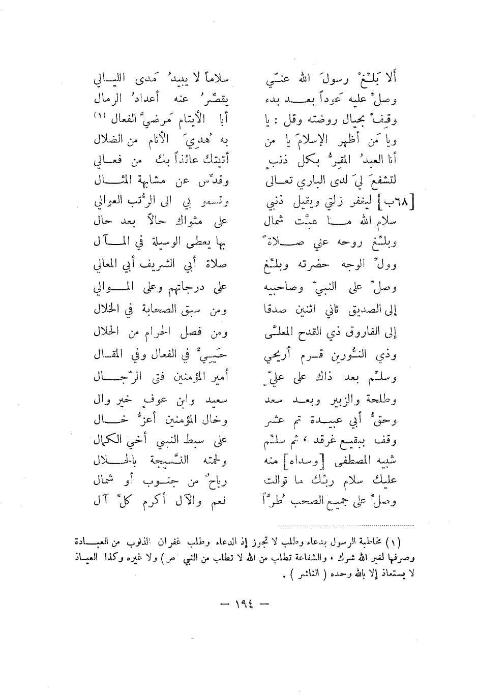 ليغفر زلتي ويقيل دنبي وتسمو بي إلى الرُّتب العوالي سلام الله ما هبَّت شمال على مثواك حالاً بعد حال
