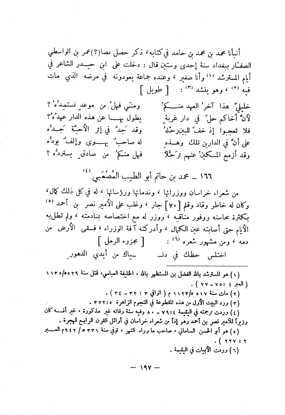 أنبأنا محمد بن محمد بن حامد في كتابه، ذكر حصل لصا (؟) عمر بن الواسطي الصفّار ببغداد سنة إحدى وستين قال: دخلت على ابن حيدر الشاعر في أيام المسترشد وأنا صغير، وعنده جماعة يعودونه في مرضه الذي مات فيه، وهو ينشد: طويل:
