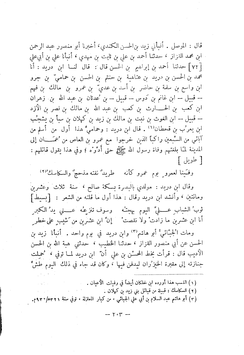 قال: الموصل. أنبأني زيد بن الحسن الكندى، أخبرنا أبو منصور عبد الرحمن ابن محمد القزاز، حدثنا أحمد بن علي بن ثابت بن مهدي، أنبأنا علي بن أبى علي حدثنا أحمد بن إبراهيم بن الحسن قال: قال لنا ابن دريد: أنا محمد بن الحسن بن دريد بن عتاهية بن حنتم بن الحسن بن حماميّ بن جرو ابن واسع بن سلمة بن حاضر بن أسد بن عديّ بن عمرو بن مالك بن فهم - قبيل - ابن غانم بن دَوس - قبيل - بن عُدثان بن عبد الله بن زهران ابن كعب بن الحارث بن كعب بن عبد الله بن مالك بن نصر بن الأزد - قبيل - ابن الغوث بن نبت بن مالك بن زيد بن كهلان بن سبأ بن يشجُب ابن يعرُب بن قحطان. قال ابن دريد: وحماميُّ هذا أول من أسلم من آبائي من السَّبعين راكباً الذين خرجوا مع عمرو بن العاص من عُمان إلى المدينة لما بلغتهم وفاة رسول الله (حتى أدَّوْه؛ وفي هذا يقول قائلهم: طويل: