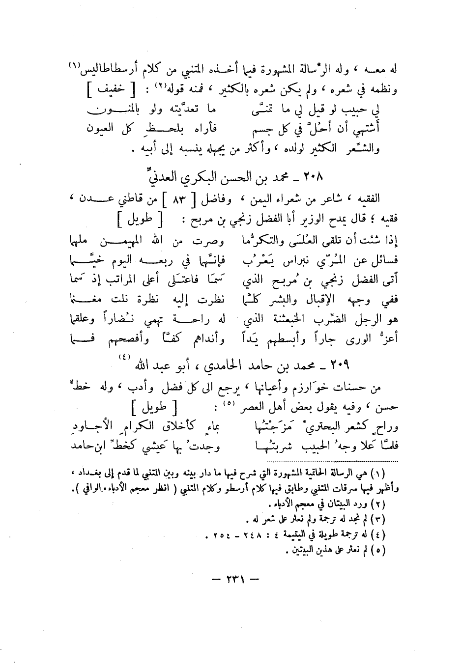 له معه، وله الرّسالة المشهورة فيما أخذه المتنبي من كلام أرسطاطاليس ونظمه في شعره، ولم يكن شعره بالكثير، فمنه قوله: خفيف:
