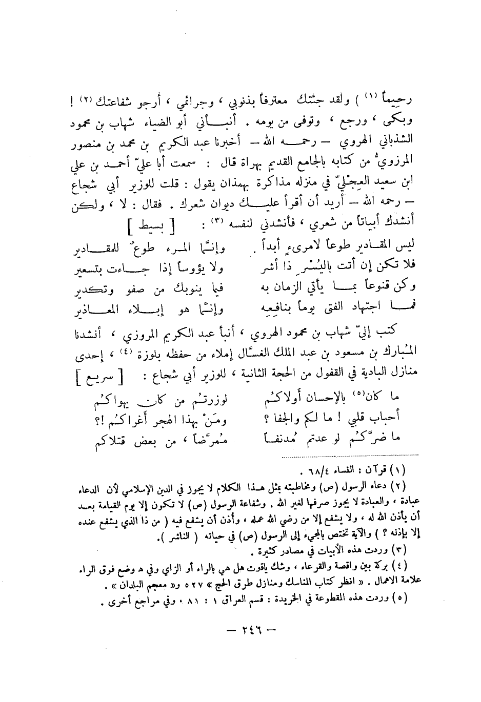 كتب إليّ شهاب بن محمود الهروي، أنبأ عبد الكريم المروزي، أنشدنا المُبارك بن مسعود بن عبد الملك الغسّال إملاء من حفظه بلوزة، إحدى منازل البادية في القفول من الحجة الثانية، للوزير أبي شجاع: سريع