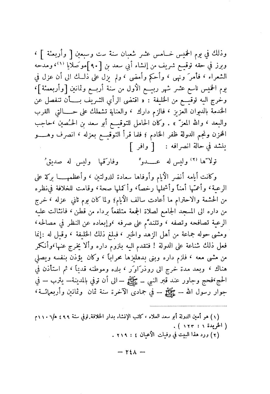 وذلك في يوم الخميس خامس عشر شعبان سنة ست وسبعين وأربعمئة، وبرز في حقه توقيع شريف من إنشاء أبي سعد بن موصلايا، ومدحه الشعراء، فأمرَ ونهى، وأحكم وأمضى، ولم يزل على ذلك إلى أن عزل في يوم الخميس تاسع عشر شهر ربيع الأول من سنة أربع وثمانين وأربعمئة، وخرج إليه توقيع من الخليفة: " اققتضى الرأي الشريف بأن تنفصل عن الخدمة بالديوان العزيز، فالزم دارك، والعناية تشملك على حالتي القرب والبعد، والله المعزّ ". وكان الحامل للتوقيع أبو سعد بن الحُصين، حاجب المخزن ونجم الدولة ضفر الخادم؛ فلما قرأ التوقيع بعزله، انصرف وهو ينشد في حالة انصرافه: وافر: