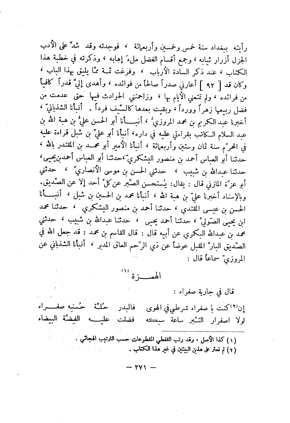 رأيته ببغداد سنة خمس وخمسين وأربعمائة، فوجدته وقد شدَّ على الأدب الجزل أزرار ثيابه، وقع أقسام الفضل ملء إهابه، وذكرته في خطبة هذا الكتاب، عند ذكر السادة الأرباب، وفرغت ثمة مما يليق بهذا الباب، وكان قد أعارني صدراً صالحاً من فوائده، وأهدى إلي قدراً كافياً من فرائده، ولم تمتعني الأيام بها، وزاحمتني الحوادث فيها حتى عدمت من فضل ربيعها زهراً وورداً، وبقيت بعدها كالسيف فرداً. أنبأنا الشذباني، أخبرنا عبد الكريم بن محمد المروزي، أنبأنا أبو الحسن علي بن هبة الله بن عبد السلام الكاتب بقراءتي عليه في داره، أنبأنا أبو علي بن شبل قراءة عليه في المحرّم سنة ثمان وستين وأربعمائة، أنبأنا الأمير أبو محمد بن المقتدر بالله، حدثنا أبو العباس أحمد بن منصور اليشكريّ، حدثنا أبو العباس أحمد بن يحيى، حدثنا عبد الله بن شبيب، حدثني الحسن بن موسى الأنصاريّ، حدثني أبو عزَّة المازني قال: يقال: يُستحسن الصبر عن كلِّ أحد إلا عن الصديق. وبالإسناد أخبرنا علي بن هبة الله، أنبأنا محمد بن الحسين بن شبل، أنبأنا الحسن بن عيسى المقتدي، حدثنا أحمد بن منصور اليشكري، حدثنا محمد ابن يحيى الصوليّ، حدثنا أحمد يحيى، حدثنا عبد الله بن شبيب، حدثني محمد بن عبد الله البكري عن أبيه قال: قال القاسم بن محمد: قد جعل الله في الصديق البارّ المقبل عِوضا عن ذي الرحم العاق المدبر، أنبأنا الشذباني عن المروزي سماعاً قال: