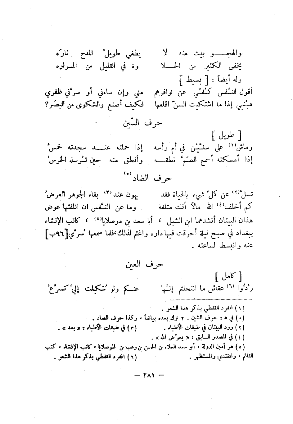أقول للنَّفس كُفِّي عن نوافرهممني وإن ساءني أو سرَّني ظفري هبْني إذا ما اشتكيت السنّ اقلعهافكيف أصنع والشكوى من البصَر؟ حرف السّين